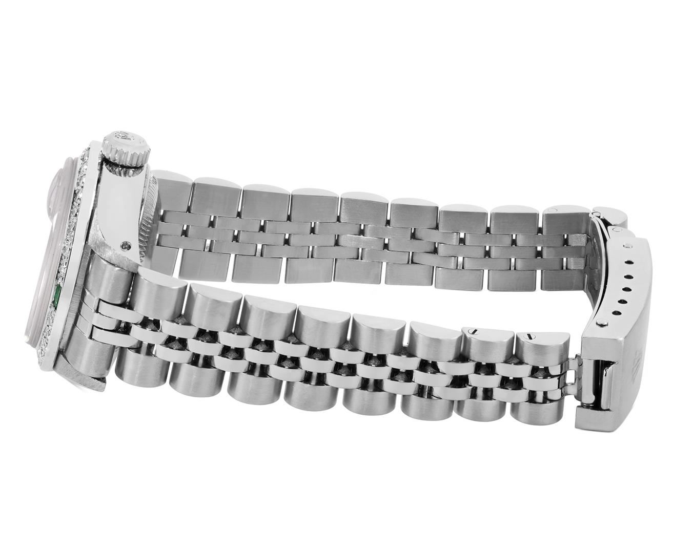 One Rolex Ladies Pre Owned Stainless Steel Date Wristwatch Polished Bright with Satin Finish, Serviced & Electronically Tested, Stainless Steel Case: 26mm, Stainless Steel Crown, Custom Bezel: New 18K White Gold Emerald Beadset Diamond Bezel, Diamond + Gem Count: 36 Diamonds + 4 Emeralds, Clarity: SI-VS, Color: G to H. Custom Crystal: New Sapphire With Magnified Date Window. Custom Hands: New Luminescent Hands. Rolex Movement: Automatic Winding Movement 2030. Rolex Dial: Factory Silver Dial With Index Hour Markers, Lumi Dots, and Dash Tracks. Date Window: 3 O'Clock Position Date Display, Model: Date. Condition: G-6 Extra Fine. Rolex Bracelet: Stainless Steel Jubilee Band. Bright Polish & Satin Finish. 6.0 Inch Length, Adjustable. Standard Clasp, With Rolex Logo. This Watch Has Been Serviced Time Tested And Is In Excellent Condition. It Is Free Of All Scratches And Dents.