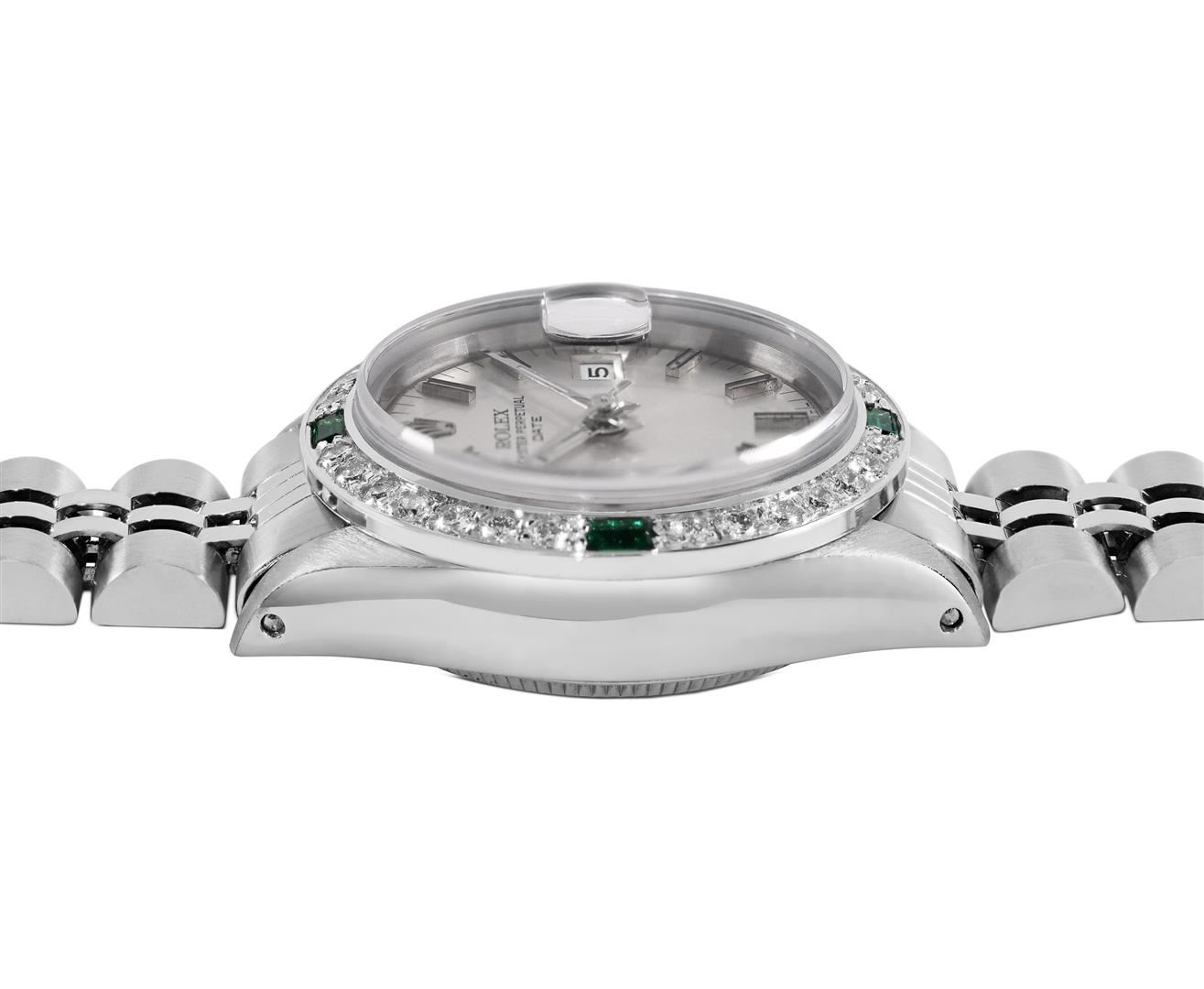 One Rolex Ladies Pre Owned Stainless Steel Date Wristwatch Polished Bright with Satin Finish, Serviced & Electronically Tested, Stainless Steel Case: 26mm, Stainless Steel Crown, Custom Bezel: New 18K White Gold Emerald Beadset Diamond Bezel, Diamond + Gem Count: 36 Diamonds + 4 Emeralds, Clarity: SI-VS, Color: G to H. Custom Crystal: New Sapphire With Magnified Date Window. Custom Hands: New Luminescent Hands. Rolex Movement: Automatic Winding Movement 2030. Rolex Dial: Factory Silver Dial With Index Hour Markers, Lumi Dots, and Dash Tracks. Date Window: 3 O'Clock Position Date Display, Model: Date. Condition: G-6 Extra Fine. Rolex Bracelet: Stainless Steel Jubilee Band. Bright Polish & Satin Finish. 6.0 Inch Length, Adjustable. Standard Clasp, With Rolex Logo. This Watch Has Been Serviced Time Tested And Is In Excellent Condition. It Is Free Of All Scratches And Dents.