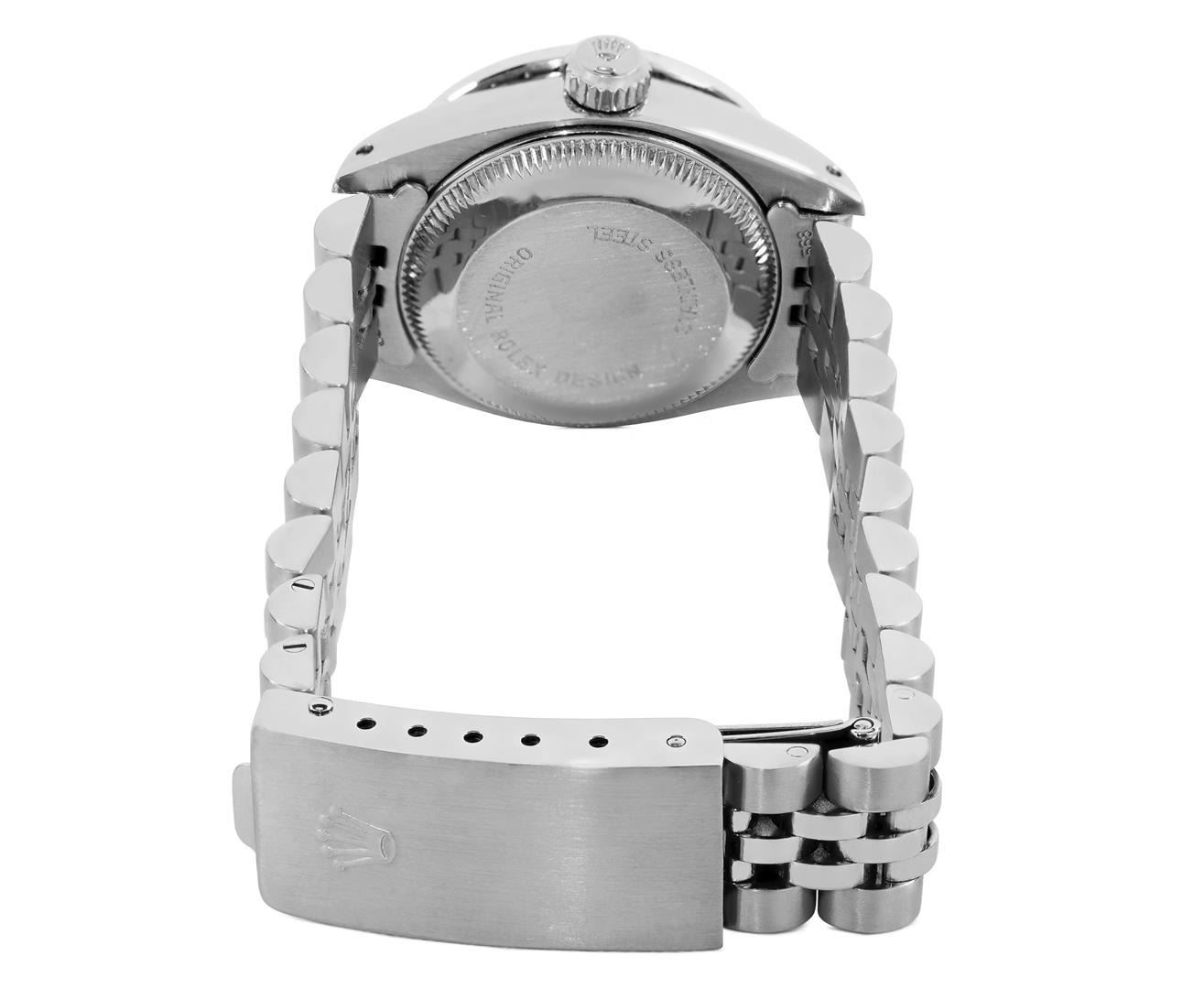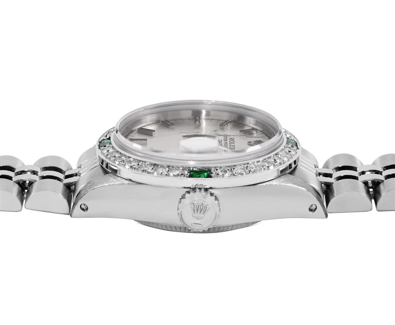 One Rolex Ladies Pre Owned Stainless Steel Date Wristwatch Polished Bright with Satin Finish, Serviced & Electronically Tested, Stainless Steel Case: 26mm, Stainless Steel Crown, Custom Bezel: New 18K White Gold Emerald Beadset Diamond Bezel, Diamond + Gem Count: 36 Diamonds + 4 Emeralds, Clarity: SI-VS, Color: G to H. Custom Crystal: New Sapphire With Magnified Date Window. Custom Hands: New Luminescent Hands. Rolex Movement: Automatic Winding Movement 2030. Rolex Dial: Factory Silver Dial With Index Hour Markers, Lumi Dots, and Dash Tracks. Date Window: 3 O'Clock Position Date Display, Model: Date. Condition: G-6 Extra Fine. Rolex Bracelet: Stainless Steel Jubilee Band. Bright Polish & Satin Finish. 6.0 Inch Length, Adjustable. Standard Clasp, With Rolex Logo. This Watch Has Been Serviced Time Tested And Is In Excellent Condition. It Is Free Of All Scratches And Dents.
