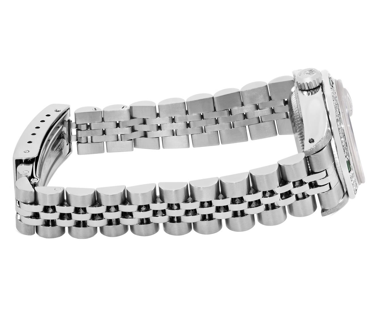 One Rolex Ladies Pre Owned Stainless Steel Date Wristwatch Polished Bright with Satin Finish, Serviced & Electronically Tested, Stainless Steel Case: 26mm, Stainless Steel Crown, Custom Bezel: New 18K White Gold Emerald Beadset Diamond Bezel, Diamond + Gem Count: 36 Diamonds + 4 Emeralds, Clarity: SI-VS, Color: G to H. Custom Crystal: New Sapphire With Magnified Date Window. Custom Hands: New Luminescent Hands. Rolex Movement: Automatic Winding Movement 2030. Rolex Dial: Factory Silver Dial With Index Hour Markers, Lumi Dots, and Dash Tracks. Date Window: 3 O'Clock Position Date Display, Model: Date. Condition: G-6 Extra Fine. Rolex Bracelet: Stainless Steel Jubilee Band. Bright Polish & Satin Finish. 6.0 Inch Length, Adjustable. Standard Clasp, With Rolex Logo. This Watch Has Been Serviced Time Tested And Is In Excellent Condition. It Is Free Of All Scratches And Dents.
