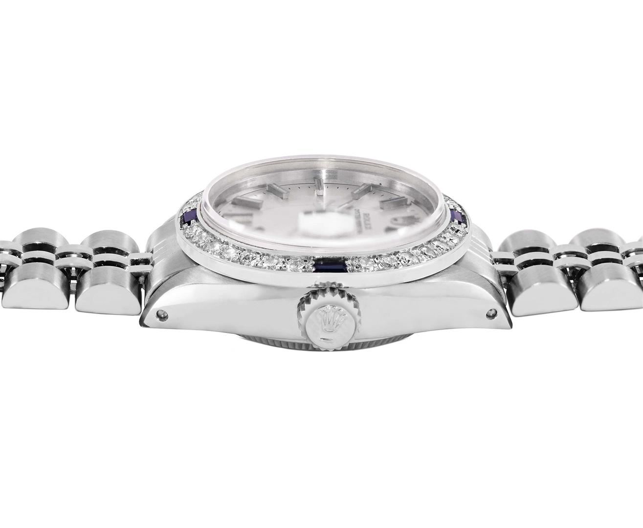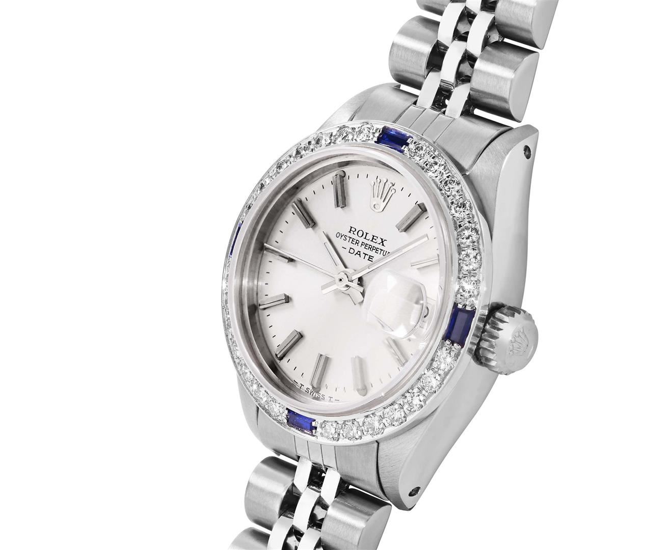 One Rolex Ladies Pre Owned Stainless Steel Date Wristwatch Polished Bright with Satin Finish, Serviced & Electronically Tested, Stainless Steel Case: 26mm, Stainless Steel Crown, Custom Bezel: New 18K White Gold Sapphire Beadset Diamond Bezel, Diamond + G