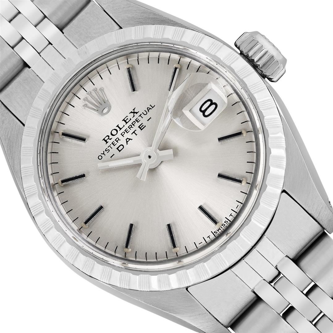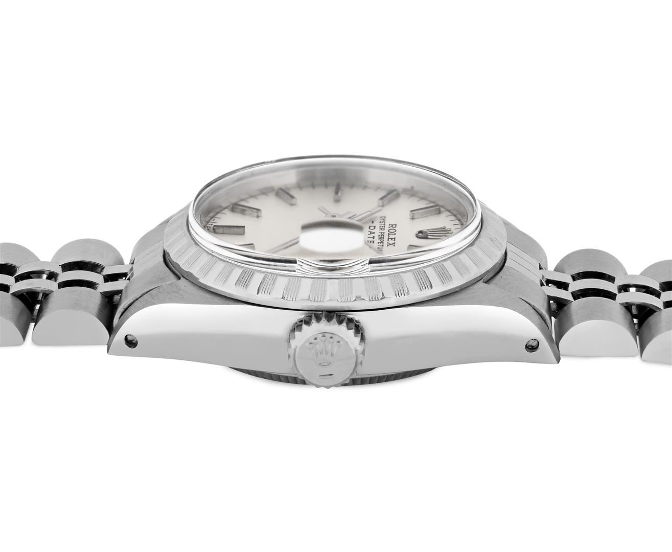 One Rolex Ladies Pre Owned Stainless Steel Date Wristwatch Polished Bright with Satin Finish, Serviced & Electronically Tested, Stainless Steel Case: 26mm, Stainless Steel Crown, Stainless Steel Engine Turn Bezel, Custom Crystal: New Acrylic With Magnifyi