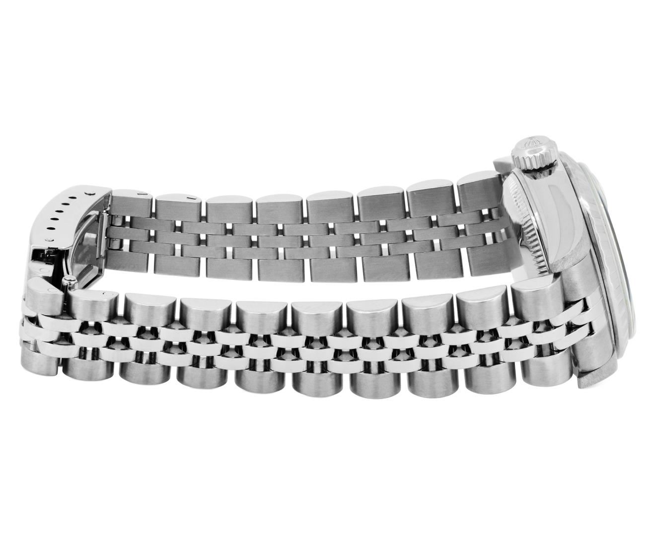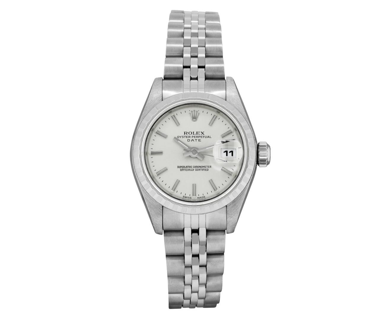 One Rolex Ladies Pre Owned Quickset Stainless Steel Date Wristwatch Polished Bright with Satin Finish, Serviced And Electronically Tested, Stainless Steel Case: 26mm, Stainless Steel Crown, Rolex Stainless Steel Engine Turn bezel. Crystal: Sapphire With Magnified Date Window. Hands: Luminescent Hands. Rolex Movement: 2235 Automatic Winding Movement. Rolex Dial: Factory Silver With Index Hour Markers, Dash Track, And Lumi Dots. Date Window: 3 O'Clock Position Date Display, Model: Sapphire Date. Condition: G-6 Extra Fine. Rolex Bracelet: Stainless Steel Jubilee Band. Bright Polish & Satin Finish. 6.0 Inch Length, Adjustable. Standard Clasp, With Rolex Logo. This Watch Has Been Serviced And Time Tested. It Is In Excellent Condition, Free Of All Scratches And Dents. This Watch Comes With A Rolex Box.