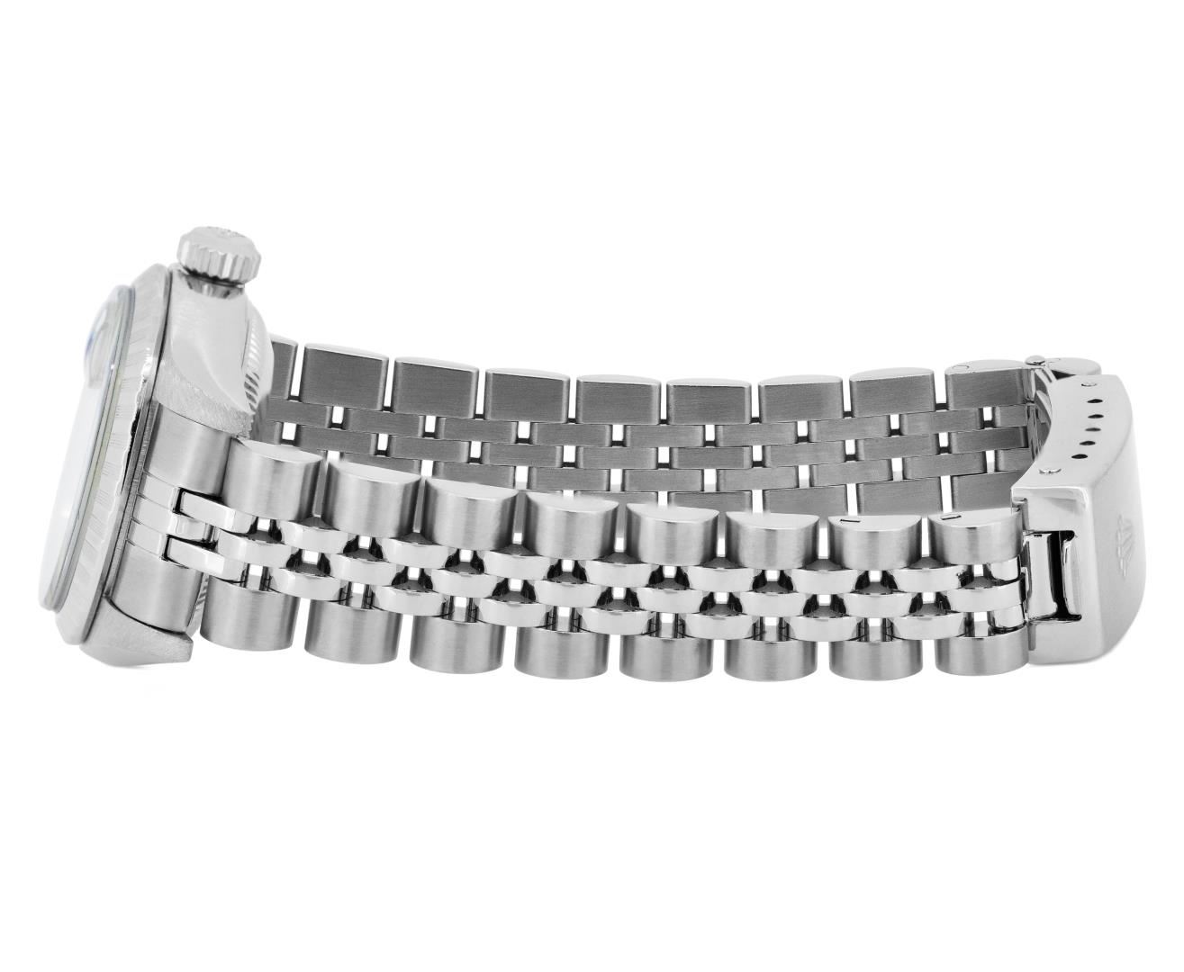 One Rolex Ladies Pre Owned Quickset Stainless Steel Date Wristwatch Polished Bright with Satin Finish, Serviced And Electronically Tested, Stainless Steel Case: 26mm, Stainless Steel Crown, Rolex Stainless Steel Engine Turn bezel. Crystal: Sapphire With Magnified Date Window. Hands: Luminescent Hands. Rolex Movement: 2235 Automatic Winding Movement. Rolex Dial: Factory Silver With Index Hour Markers, Dash Track, And Lumi Dots. Date Window: 3 O'Clock Position Date Display, Model: Sapphire Date. Condition: G-6 Extra Fine. Rolex Bracelet: Stainless Steel Jubilee Band. Bright Polish & Satin Finish. 6.0 Inch Length, Adjustable. Standard Clasp, With Rolex Logo. This Watch Has Been Serviced And Time Tested. It Is In Excellent Condition, Free Of All Scratches And Dents. This Watch Comes With A Rolex Box.