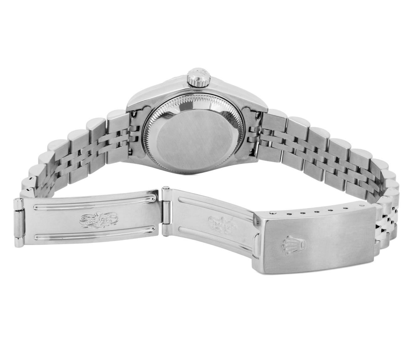 One Rolex Ladies Pre Owned Quickset Stainless Steel Date Wristwatch Polished Bright with Satin Finish, Serviced And Electronically Tested, Stainless Steel Case: 26mm, Stainless Steel Crown, Rolex Stainless Steel Engine Turn bezel. Crystal: Sapphire With Magnified Date Window. Hands: Luminescent Hands. Rolex Movement: 2235 Automatic Winding Movement. Rolex Dial: Factory Silver With Index Hour Markers, Dash Track, And Lumi Dots. Date Window: 3 O'Clock Position Date Display, Model: Sapphire Date. Condition: G-6 Extra Fine. Rolex Bracelet: Stainless Steel Jubilee Band. Bright Polish & Satin Finish. 6.0 Inch Length, Adjustable. Standard Clasp, With Rolex Logo. This Watch Has Been Serviced And Time Tested. It Is In Excellent Condition, Free Of All Scratches And Dents. This Watch Comes With A Rolex Box.