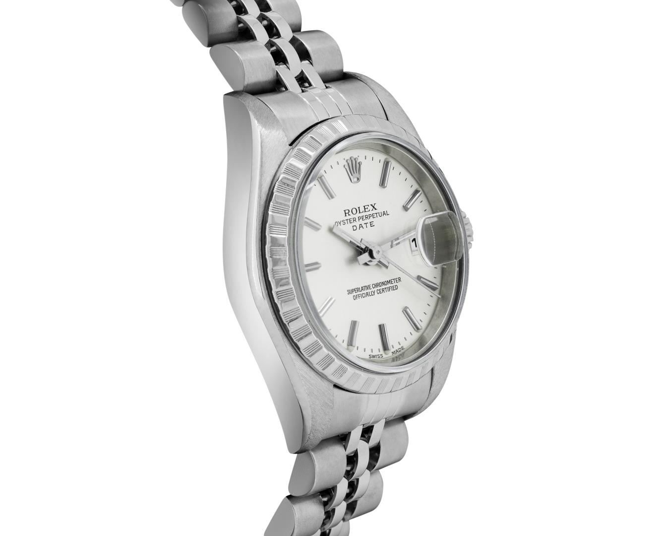 One Rolex Ladies Pre Owned Quickset Stainless Steel Date Wristwatch Polished Bright with Satin Finish, Serviced And Electronically Tested, Stainless Steel Case: 26mm, Stainless Steel Crown, Rolex Stainless Steel Engine Turn bezel. Crystal: Sapphire With Magnified Date Window. Hands: Luminescent Hands. Rolex Movement: 2235 Automatic Winding Movement. Rolex Dial: Factory Silver With Index Hour Markers, Dash Track, And Lumi Dots. Date Window: 3 O'Clock Position Date Display, Model: Sapphire Date. Condition: G-6 Extra Fine. Rolex Bracelet: Stainless Steel Jubilee Band. Bright Polish & Satin Finish. 6.0 Inch Length, Adjustable. Standard Clasp, With Rolex Logo. This Watch Has Been Serviced And Time Tested. It Is In Excellent Condition, Free Of All Scratches And Dents. This Watch Comes With A Rolex Box.