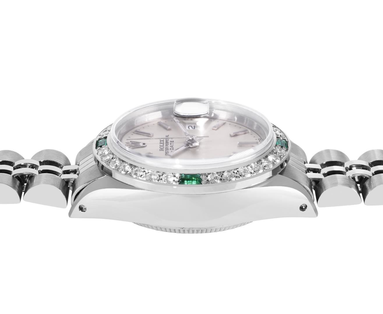 One Rolex Ladies Pre Owned Stainless Steel Date Wristwatch Polished Bright with Satin Finish, Serviced & Electronically Tested, Stainless Steel Case: 26mm, Stainless Steel Crown, Custom Bezel: New 18K White Gold Emerald Beadset Diamond Bezel, Diamond + Gem Count: 36 Diamonds + 4 Emeralds. Custom Crystal: New Sapphire With Magnified Date Window. Custom Hands: New Luminescent Hands. Rolex Movement: Automatic Winding Movement 2035. Rolex Dial: Factory Silver With Index Hour Markers, Lumi Dots, and Dash Tracks. Date Window: 3 O'Clock Position Date Display, Model: Date. Condition: G-6 Extra Fine. Rolex Bracelet: Stainless Steel Jubilee Band. Bright Polish & Satin Finish. 6.0 Inch Length, Adjustable. Standard Clasp, With Rolex Logo. This Watch Has Been Serviced Time Tested And Is In Excellent Condition. It Is Free Of All Scratches And Dents.