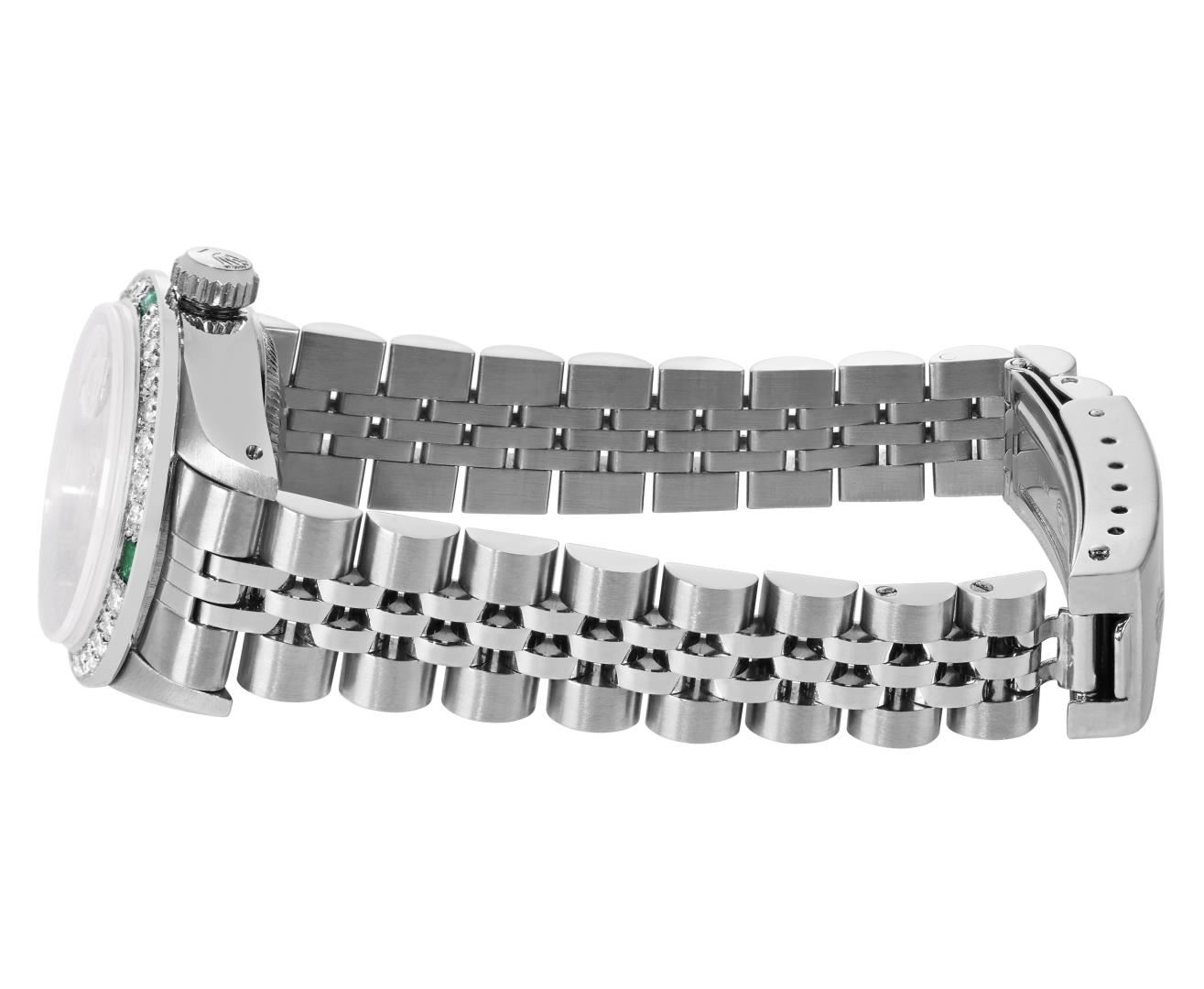 One Rolex Ladies Pre Owned Stainless Steel Date Wristwatch Polished Bright with Satin Finish, Serviced & Electronically Tested, Stainless Steel Case: 26mm, Stainless Steel Crown, Custom Bezel: New 18K White Gold Emerald Beadset Diamond Bezel, Diamond + Gem Count: 36 Diamonds + 4 Emeralds. Custom Crystal: New Sapphire With Magnified Date Window. Custom Hands: New Luminescent Hands. Rolex Movement: Automatic Winding Movement 2035. Rolex Dial: Factory Silver With Index Hour Markers, Lumi Dots, and Dash Tracks. Date Window: 3 O'Clock Position Date Display, Model: Date. Condition: G-6 Extra Fine. Rolex Bracelet: Stainless Steel Jubilee Band. Bright Polish & Satin Finish. 6.0 Inch Length, Adjustable. Standard Clasp, With Rolex Logo. This Watch Has Been Serviced Time Tested And Is In Excellent Condition. It Is Free Of All Scratches And Dents.