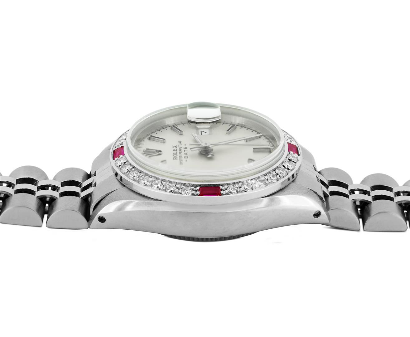 One Rolex Ladies Pre Owned Stainless Steel Date Wristwatch Polished Bright with Satin Finish, Serviced & Electronically Tested, Stainless Steel Case: 26mm, Stainless Steel Crown, Custom Bezel: New 18K White Gold Ruby Beadset Diamond Bezel, Diamond + Gem C