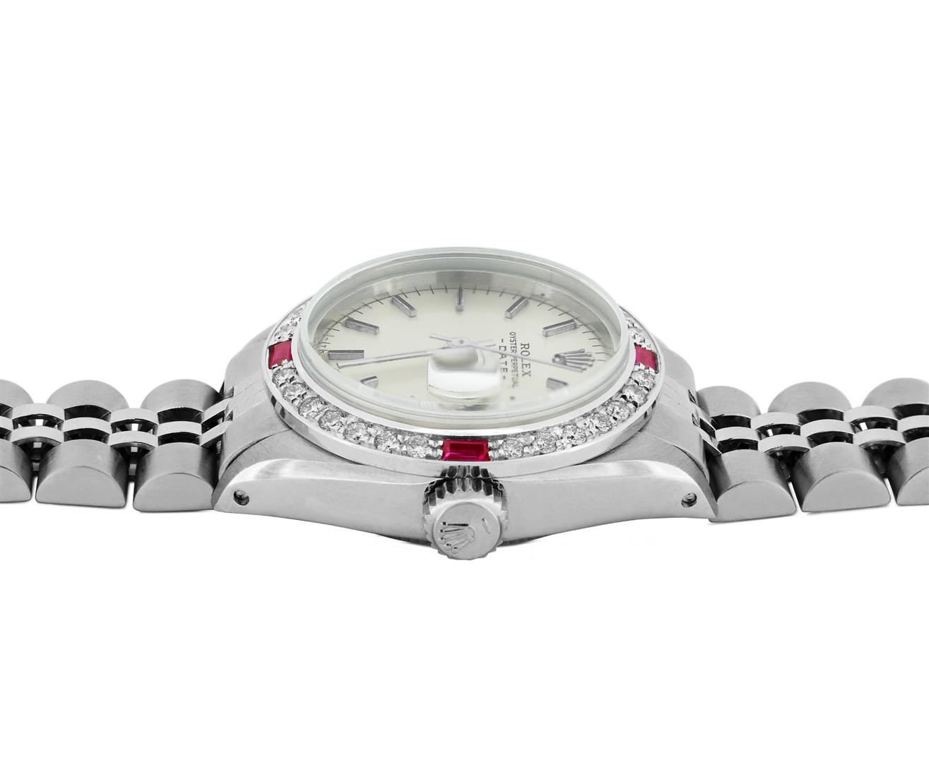 One Rolex Ladies Pre Owned Stainless Steel Date Wristwatch Polished Bright with Satin Finish, Serviced & Electronically Tested, Stainless Steel Case: 26mm, Stainless Steel Crown, Custom Bezel: New 18K White Gold Ruby Beadset Diamond Bezel, Diamond + Gem Count: 36 Diamonds + 4 Rubies, Clarity: SI-VS, Color: G to H. Custom Crystal: New Sapphire With Magnified Date Window. Custom Hands: New Luminescent Hands. Rolex Movement: Automatic Winding Movement. Rolex Dial: Factory Silver Dial With Black Index Hour Markers And Lumi Dots. Date Window: 3 O'Clock Position Date Display, Model: Datej. Condition: G-6 Extra Fine. Rolex Bracelet: Stainless Steel Jubilee Band. Bright Polish & Satin Finish. 6.0 Inch Length, Adjustable. Standard Clasp, With Rolex Logo. This Watch Has Been Serviced Time Tested And Is In Excellent Condition. It Is Free Of All Scratches And Dents. This Watch Comes With A Rolex Box.