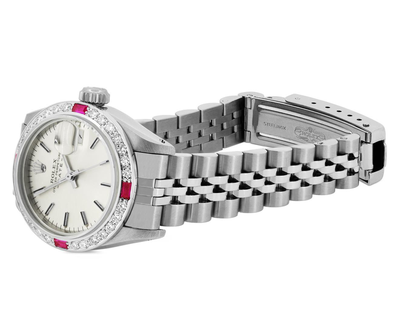 One Rolex Ladies Pre Owned Stainless Steel Date Wristwatch Polished Bright with Satin Finish, Serviced & Electronically Tested, Stainless Steel Case: 26mm, Stainless Steel Crown, Custom Bezel: New 18K White Gold Ruby Beadset Diamond Bezel, Diamond + Gem Count: 36 Diamonds + 4 Rubies, Clarity: SI-VS, Color: G to H. Custom Crystal: New Sapphire With Magnified Date Window. Custom Hands: New Luminescent Hands. Rolex Movement: Automatic Winding Movement. Rolex Dial: Factory Silver Dial With Black Index Hour Markers And Lumi Dots. Date Window: 3 O'Clock Position Date Display, Model: Datej. Condition: G-6 Extra Fine. Rolex Bracelet: Stainless Steel Jubilee Band. Bright Polish & Satin Finish. 6.0 Inch Length, Adjustable. Standard Clasp, With Rolex Logo. This Watch Has Been Serviced Time Tested And Is In Excellent Condition. It Is Free Of All Scratches And Dents. This Watch Comes With A Rolex Box.