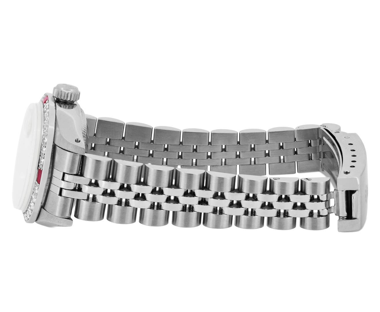 One Rolex Ladies Pre Owned Stainless Steel Date Wristwatch Polished Bright with Satin Finish, Serviced & Electronically Tested, Stainless Steel Case: 26mm, Stainless Steel Crown, Custom Bezel: New 18K White Gold Ruby Beadset Diamond Bezel, Diamond + Gem Count: 36 Diamonds + 4 Rubies, Clarity: SI-VS, Color: G to H. Custom Crystal: New Sapphire With Magnified Date Window. Custom Hands: New Luminescent Hands. Rolex Movement: Automatic Winding Movement. Rolex Dial: Factory Silver Dial With Black Index Hour Markers And Lumi Dots. Date Window: 3 O'Clock Position Date Display, Model: Datej. Condition: G-6 Extra Fine. Rolex Bracelet: Stainless Steel Jubilee Band. Bright Polish & Satin Finish. 6.0 Inch Length, Adjustable. Standard Clasp, With Rolex Logo. This Watch Has Been Serviced Time Tested And Is In Excellent Condition. It Is Free Of All Scratches And Dents. This Watch Comes With A Rolex Box.