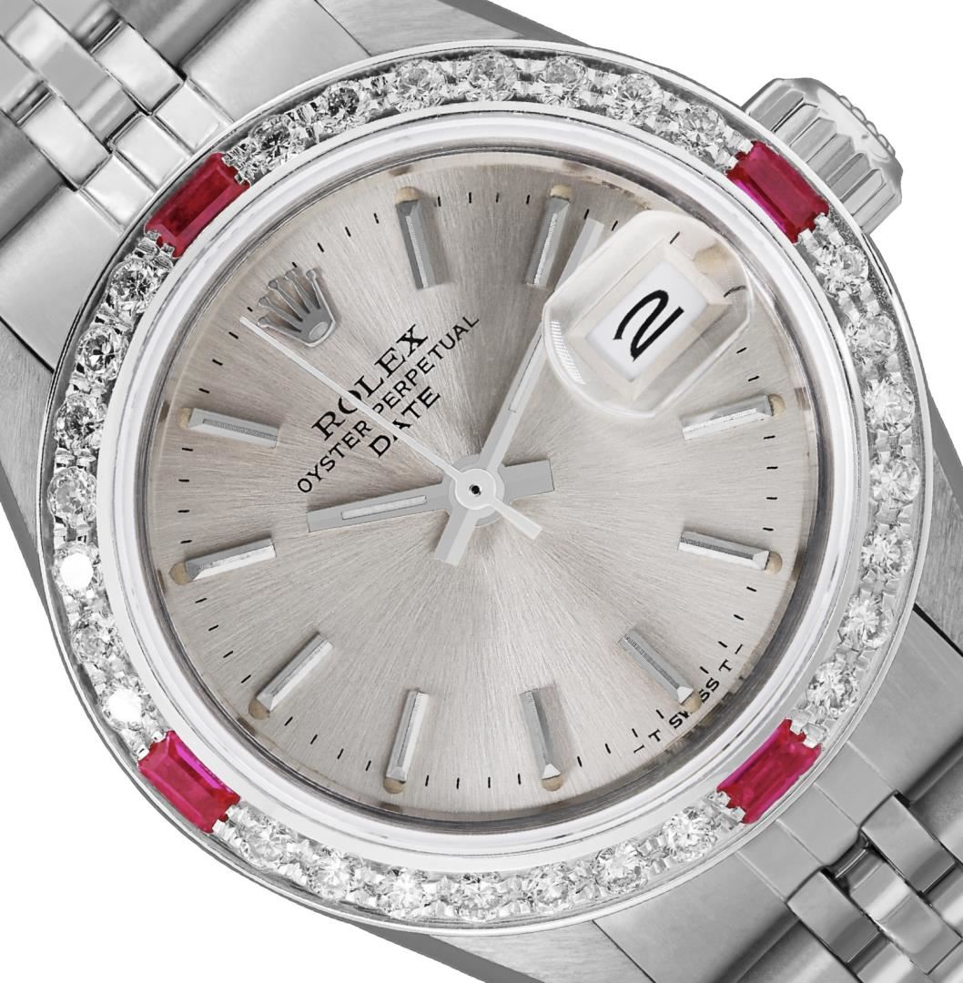 One Rolex Ladies Pre Owned Stainless Steel Date Wristwatch Polished Bright with Satin Finish, Serviced & Electronically Tested, Stainless Steel Case: 26mm, Stainless Steel Crown, Custom Bezel: New 18K White Gold Ruby Beadset Diamond Bezel, Diamond + Gem Count: 36 Diamonds + 4 Rubies. Custom Crystal: New Sapphire With Magnified Date Window. Custom Hands: New Luminescent Hands. Rolex Movement: Automatic Winding Movement 2035. Rolex Dial: Factory Silver With Index Hour Markers And Lumi Dots. Date Window: 3 O'Clock Position Date Display, Model: Date. Condition: G-6 Extra Fine. Rolex Bracelet: Stainless Steel Jubilee Band. Bright Polish & Satin Finish. 6.0 Inch Length, Adjustable. Standard Clasp, With Rolex Logo. This Watch Has Been Serviced Time Tested And Is In Excellent Condition. It Is Free Of All Scratches And Dents.