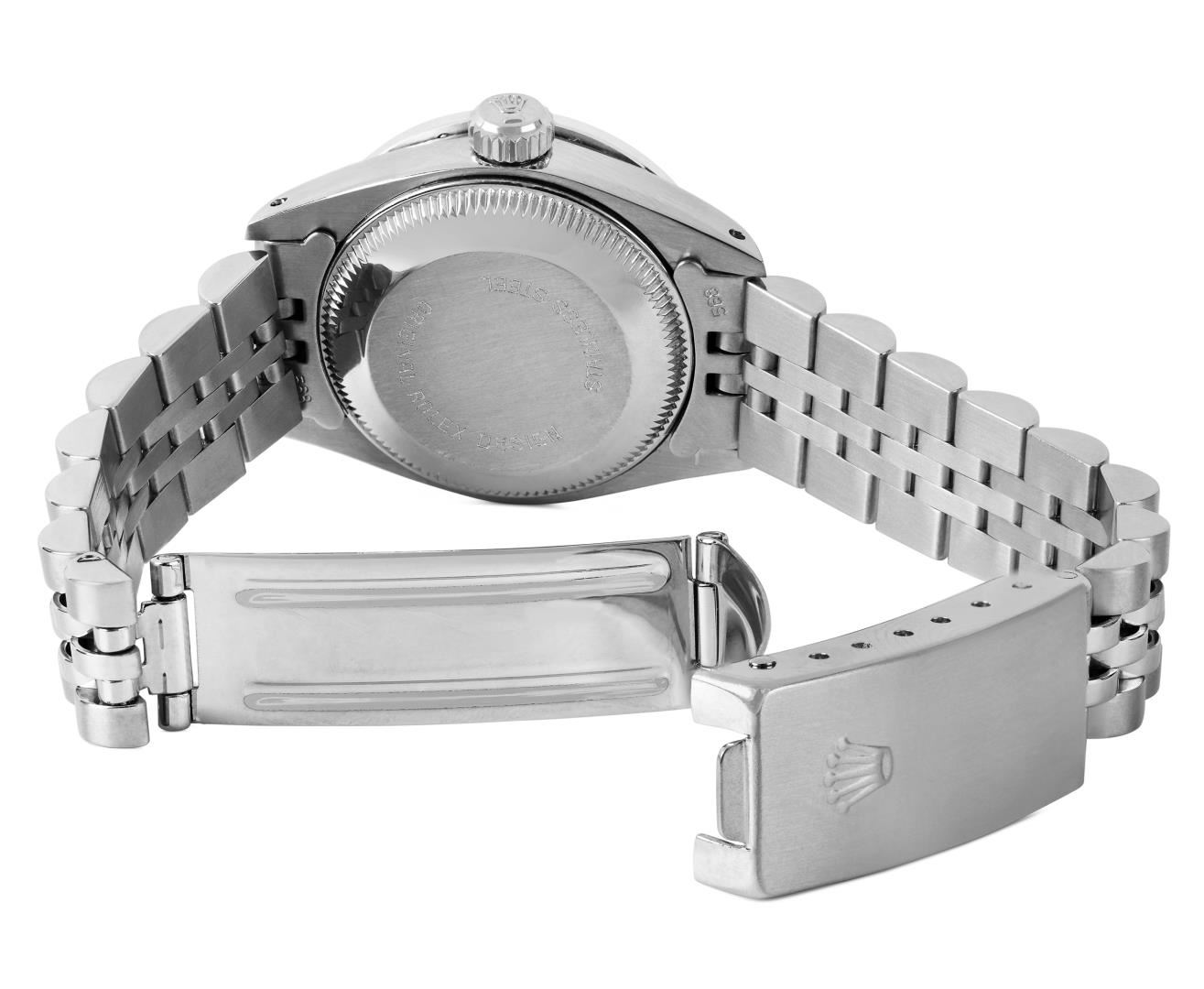 One Rolex Ladies Pre Owned Stainless Steel Date Wristwatch Polished Bright with Satin Finish, Serviced & Electronically Tested, Stainless Steel Case: 26mm, Stainless Steel Crown, Custom Bezel: New 18K White Gold Ruby Beadset Diamond Bezel, Diamond + Gem Count: 36 Diamonds + 4 Rubies. Custom Crystal: New Sapphire With Magnified Date Window. Custom Hands: New Luminescent Hands. Rolex Movement: Automatic Winding Movement 2035. Rolex Dial: Factory Silver With Index Hour Markers And Lumi Dots. Date Window: 3 O'Clock Position Date Display, Model: Date. Condition: G-6 Extra Fine. Rolex Bracelet: Stainless Steel Jubilee Band. Bright Polish & Satin Finish. 6.0 Inch Length, Adjustable. Standard Clasp, With Rolex Logo. This Watch Has Been Serviced Time Tested And Is In Excellent Condition. It Is Free Of All Scratches And Dents.