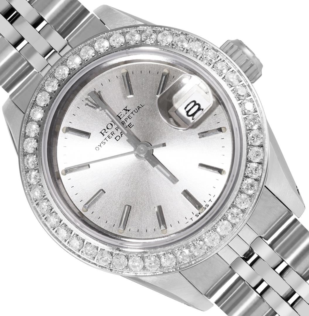 One Rolex Ladies Pre Owned Stainless Steel Date Wristwatch Polished Bright with Satin Finish, Serviced & Electronically Tested, Stainless Steel Case: 26mm, Stainless Steel Crown, Custom Bezel: New Stainless Steel Beadset Diamond Bezel, Diamond Count: 40 Diamonds. Custom Crystal: New Sapphire With Magnified Date Window. Custom Hands: New Luminescent Hands. Rolex Movement: Automatic Winding Movement 2035. Rolex Dial: Factory Silver With Index Hour Markers And Lumi Dots. Date Window: 3 O'Clock Position Date Display, Model: Date. Condition: G-6 Extra Fine. Rolex Bracelet: Stainless Steel Jubilee Band. Bright Polish And Satin Finish. 6.0 Inch Length, Adjustable. Standard Clasp, With Rolex Logo. This Watch Has Been Serviced And Time Tested. It Is In Excellent Condition, Free Of All Scratches And Dents. This Watch Comes With A Rolex Box.