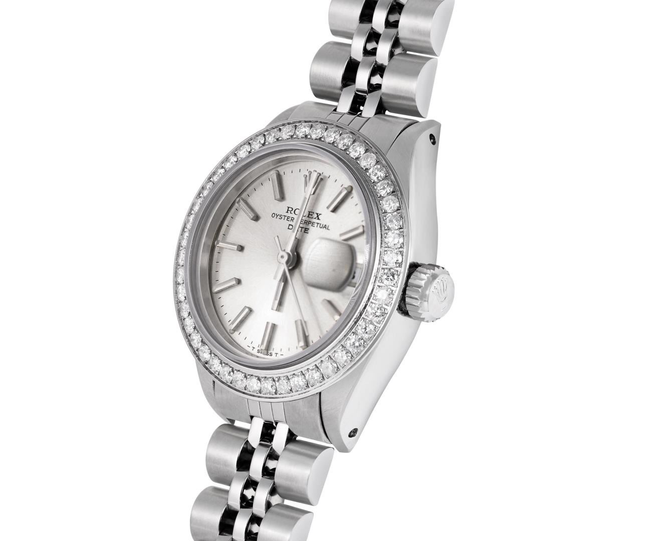 One Rolex Ladies Pre Owned Stainless Steel Date Wristwatch Polished Bright with Satin Finish, Serviced & Electronically Tested, Stainless Steel Case: 26mm, Stainless Steel Crown, Custom Bezel: New Stainless Steel Beadset Diamond Bezel, Diamond Count: 40 Diamonds. Custom Crystal: New Sapphire With Magnified Date Window. Custom Hands: New Luminescent Hands. Rolex Movement: Automatic Winding Movement 2035. Rolex Dial: Factory Silver With Index Hour Markers And Lumi Dots. Date Window: 3 O'Clock Position Date Display, Model: Date. Condition: G-6 Extra Fine. Rolex Bracelet: Stainless Steel Jubilee Band. Bright Polish And Satin Finish. 6.0 Inch Length, Adjustable. Standard Clasp, With Rolex Logo. This Watch Has Been Serviced And Time Tested. It Is In Excellent Condition, Free Of All Scratches And Dents. This Watch Comes With A Rolex Box.
