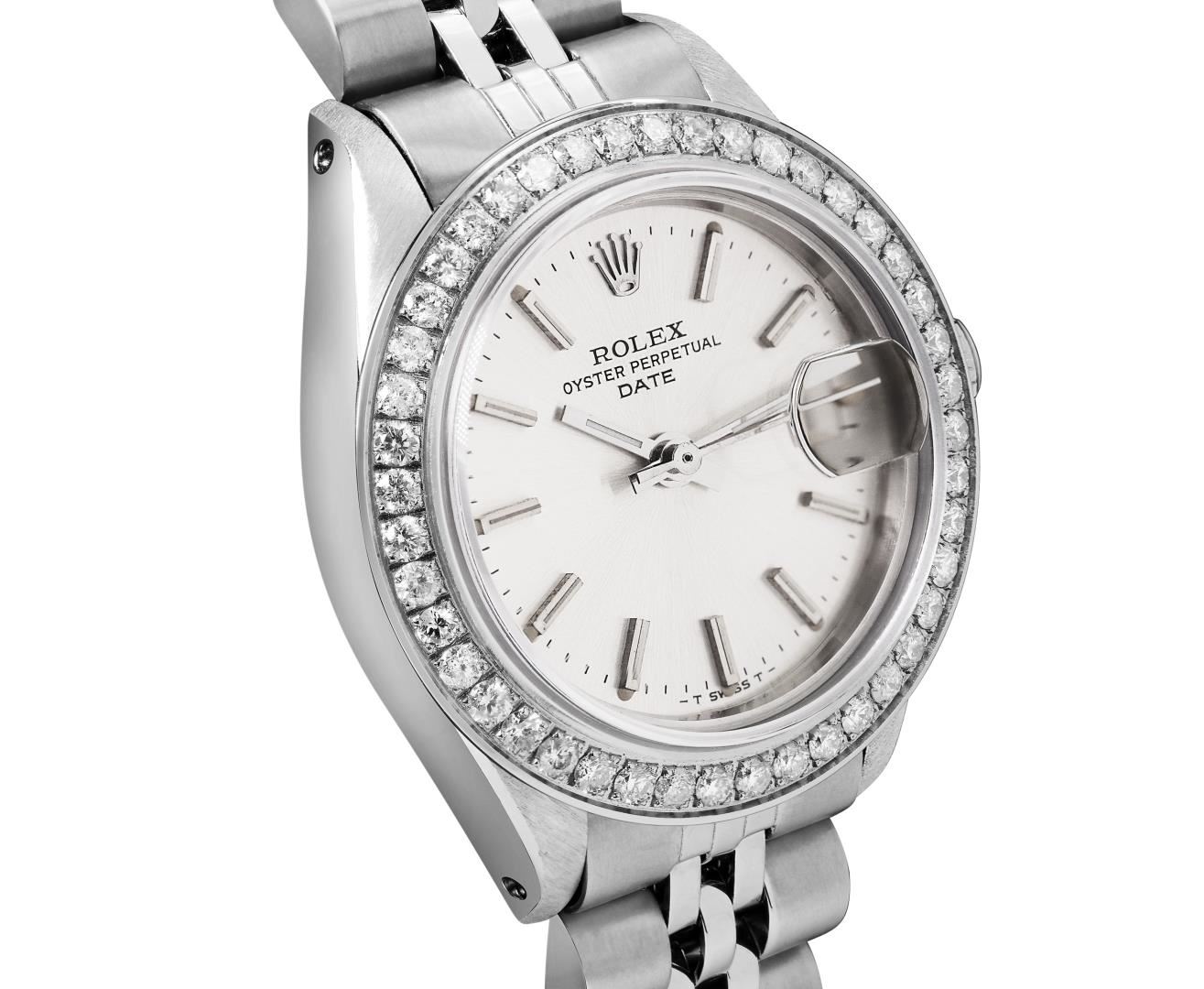 One Rolex Ladies Pre Owned Stainless Steel Date Wristwatch Polished Bright with Satin Finish, Serviced & Electronically Tested, Stainless Steel Case: 26mm, Stainless Steel Crown, Custom Bezel: New Stainless Steel Beadset Diamond Bezel, Diamond Count: 40 Diamonds On Bezel. Custom Crystal: New Sapphire With Magnified Date Window. Custom Hands: New Luminescent Hands. Rolex Movement: Automatic Winding Movement 2035. Rolex Dial: Factory Silver With Index Hour Markers And Lumi Dots. Date Window: 3 O'Clock Position Date Display, Model: Date. Condition: G-6 Extra Fine. Rolex Bracelet: Stainless Steel Jubilee Band. Bright Polish And Satin Finish. 6.0 Inch Length, Adjustable. Standard Clasp, With Rolex Logo. This Watch Has Been Serviced And Time Tested. It Is In Excellent Condition, Free Of All Scratches And Dents. This Watch Comes With A Rolex Box.