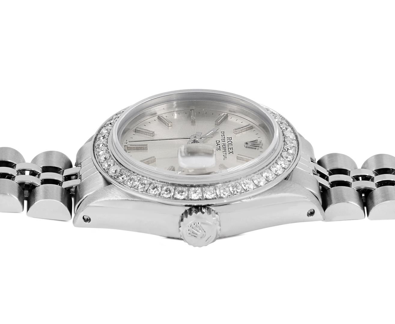One Rolex Ladies Pre Owned Stainless Steel Date Wristwatch Polished Bright with Satin Finish, Serviced & Electronically Tested, Stainless Steel Case: 26mm, Stainless Steel Crown, Custom Bezel: New Stainless Steel Beadset Diamond Bezel, Diamond Count: 40 Diamonds On Bezel. Custom Crystal: New Sapphire With Magnified Date Window. Custom Hands: New Luminescent Hands. Rolex Movement: Automatic Winding Movement 2035. Rolex Dial: Factory Silver With Index Hour Markers And Lumi Dots. Date Window: 3 O'Clock Position Date Display, Model: Date. Condition: G-6 Extra Fine. Rolex Bracelet: Stainless Steel Jubilee Band. Bright Polish And Satin Finish. 6.0 Inch Length, Adjustable. Standard Clasp, With Rolex Logo. This Watch Has Been Serviced And Time Tested. It Is In Excellent Condition, Free Of All Scratches And Dents. This Watch Comes With A Rolex Box.
