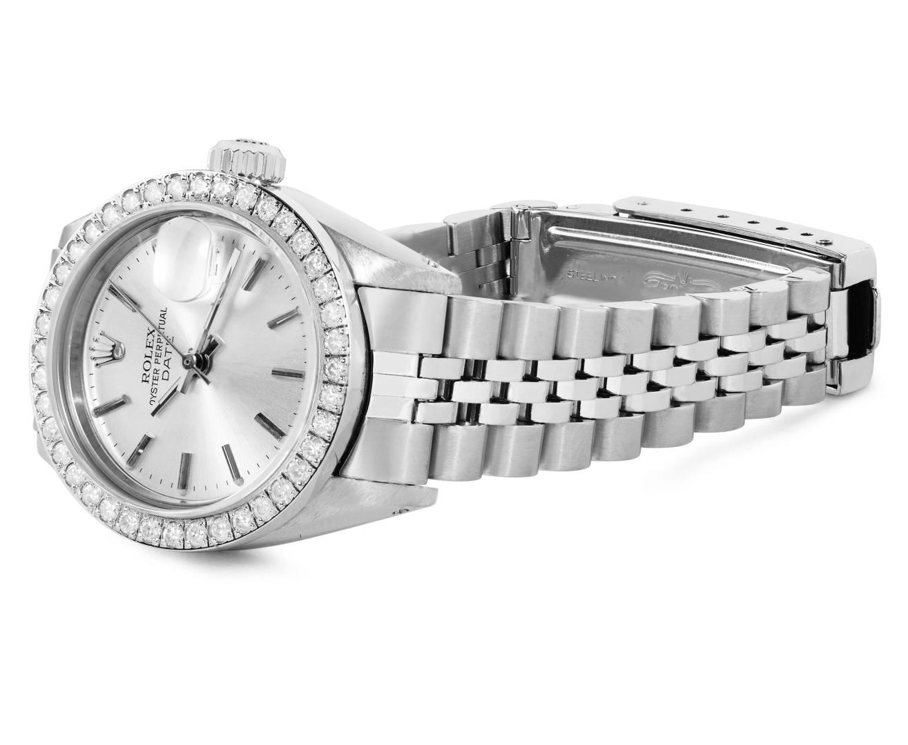 One Rolex Ladies Pre Owned Stainless Steel Date Wristwatch Polished Bright with Satin Finish, Serviced & Electronically Tested, Stainless Steel Case: 26mm, Stainless Steel Crown, Custom Bezel: New Stainless Steel Diamond Bezel, Diamond Count: 44 Diamonds. Custom Crystal: New Sapphire With Magnified Date Window. Custom Hands: New Luminescent Hands. Rolex Movement: Automatic Winding Movement 2035. Rolex Dial: Factory Silver Dial With Index Hour Markers And Lumi Dots. Date Window: 3 O'Clock Position Date Display, Model: Date. Condition: G-6 Extra Fine. Rolex Bracelet: Stainless Steel Jubilee Band. Bright Polish And Satin Finish. 6.0 Inch Length, Adjustable. Standard Clasp, With Rolex Logo. This Watch Has Been Serviced And Time Tested. It Is In Excellent Condition, Free Of All Scratches And Dents. This Watch Comes With A Rolex Box.