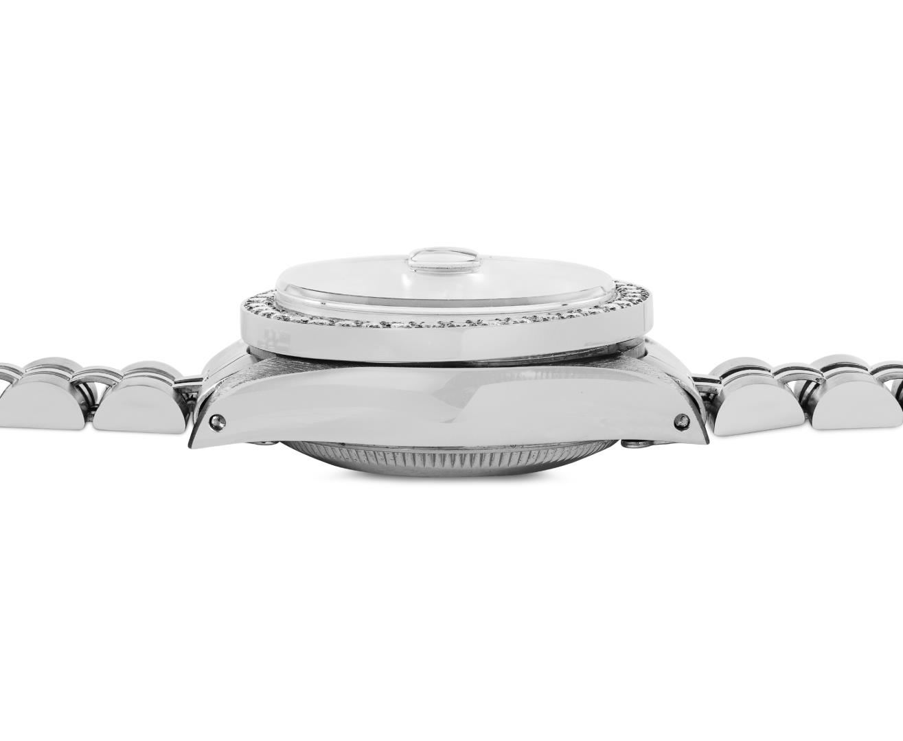 One Rolex Ladies Pre Owned Stainless Steel Date Wristwatch Polished Bright with Satin Finish, Serviced & Electronically Tested, Stainless Steel Case: 26mm, Stainless Steel Crown, Custom Bezel: New Stainless Steel Diamond Bezel, Diamond Count: 44 Diamonds. Custom Crystal: New Sapphire With Magnified Date Window. Custom Hands: New Luminescent Hands. Rolex Movement: Automatic Winding Movement 2035. Rolex Dial: Factory Silver Dial With Index Hour Markers And Lumi Dots. Date Window: 3 O'Clock Position Date Display, Model: Date. Condition: G-6 Extra Fine. Rolex Bracelet: Stainless Steel Jubilee Band. Bright Polish And Satin Finish. 6.0 Inch Length, Adjustable. Standard Clasp, With Rolex Logo. This Watch Has Been Serviced And Time Tested. It Is In Excellent Condition, Free Of All Scratches And Dents. This Watch Comes With A Rolex Box.