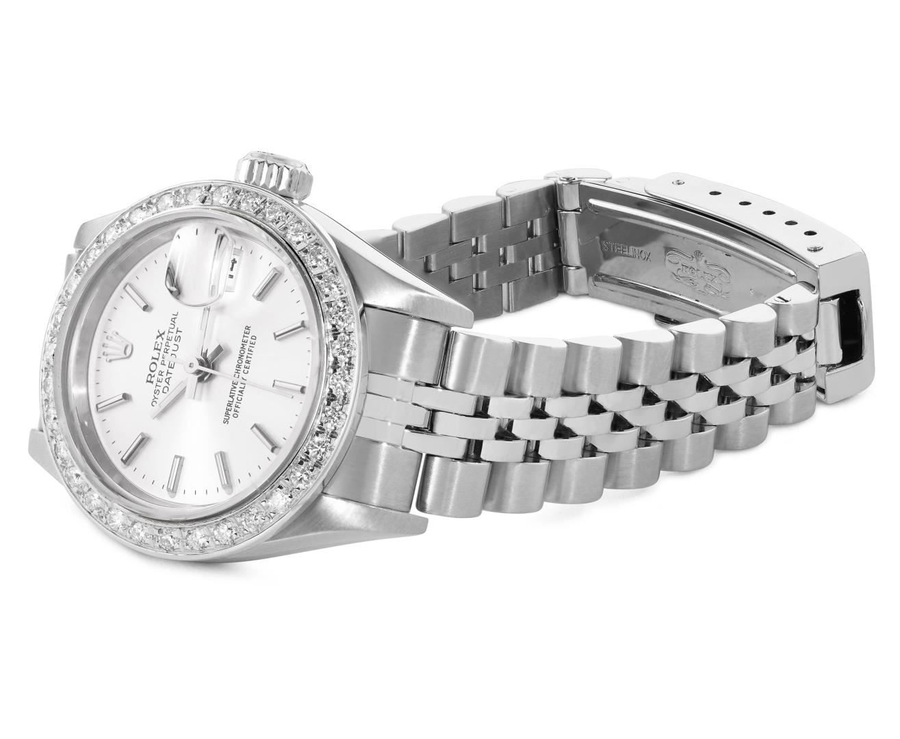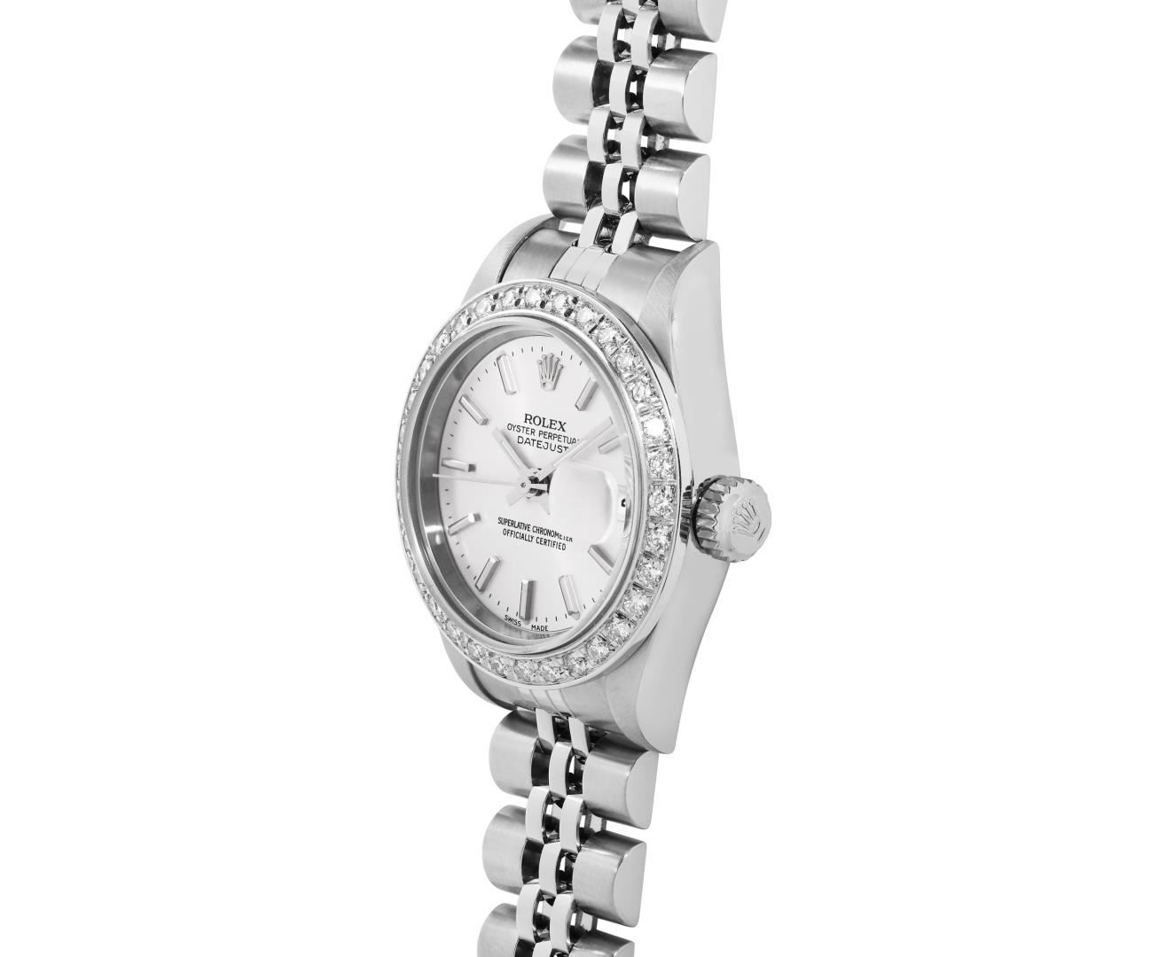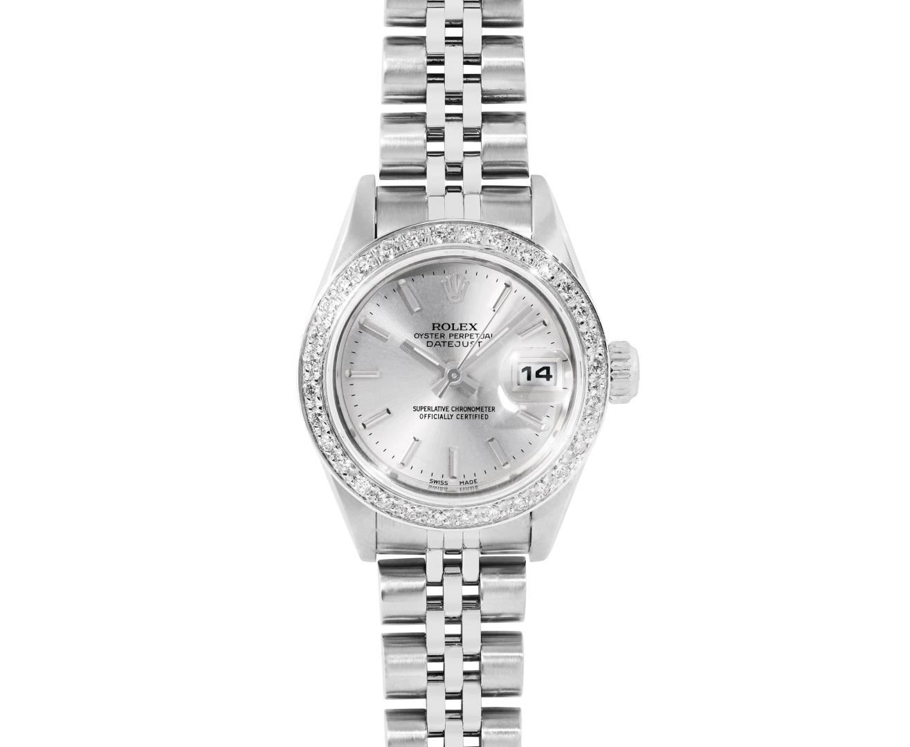 One Rolex Ladies Pre Owned Quickset Stainless Steel Datejust Wristwatch Polished Bright with Satin Finish, Serviced And Electronically Tested, Stainless Steel Case: 26mm, Stainless Steel Crown, Custom Bezel: New 18K White Gold Beadset Diamond Bezel, Diamond Count: 32 Diamonds. Custom Crystal: New Sapphire With Magnified Date Window. Custom Hands: New Luminescent Hands. Rolex Movement: 2235 Automatic Winding Movement. Rolex Dial: Factory Silver With Index Hour Markers, and Square Track. Date Window: 3 O'Clock Position Date Display, Model: Quickset Datejust. Condition: G-6 Extra Fine. Rolex Bracelet: Stainless Steel Jubilee Band. Bright Polish & Satin Finish. 6.0 Inch Length, Adjustable. Standard Clasp, With Rolex Logo. This Watch Has Been Serviced Time Tested And Is In Excellent Condition. It Is Free Of All Scratches And Dents. This Watch Comes With A Rolex Box.