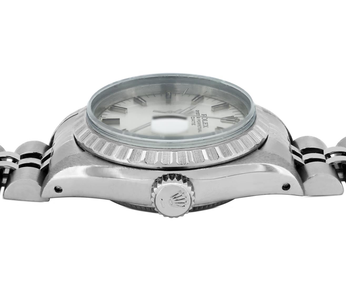 One Rolex Ladies Pre Owned Stainless Steel Date Wristwatch Polished Bright with Satin Finish, Serviced & Electronically Tested, Stainless Steel Case: 26mm, Stainless Steel Crown, Stainless Steel Engine Turn Bezel, Custom Crystal: New Acrylic With Magnifying Date Window. Custom Hands: New Luminescent Hands. Rolex Movement: Automatic Winding Movement 2035. Rolex Dial: Factory Silver With Index Hour Markers And Lumi Dots. Date Window: 3 O'Clock Position Date Display, Model: Datejust. Condition: G-6 Extra Fine. Rolex Bracelet: Stainless Steel Jubilee Band. Bright Polish & Satin Finish. 6.0 Inch Length, Adjustable. Standard Clasp, With Rolex Logo. This Watch Has Been Serviced Time Tested And Is In Excellent Condition. It Is Free Of All Scratches And Dents.