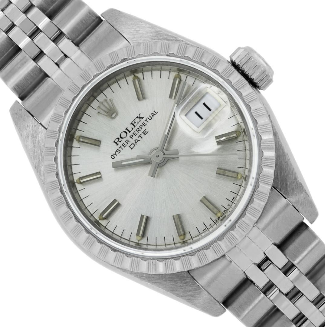 One Rolex Ladies Pre Owned Stainless Steel Date Wristwatch Polished Bright with Satin Finish, Serviced & Electronically Tested, Stainless Steel Case: 26mm, Stainless Steel Crown, Stainless Steel Engine Turn Bezel, Custom Crystal: New Acrylic With Magnifying Date Window. Custom Hands: New Luminescent Hands. Rolex Movement: Automatic Winding Movement 2035. Rolex Dial: Factory Silver With Index Hour Markers And Lumi Dots. Date Window: 3 O'Clock Position Date Display, Model: Datejust. Condition: G-6 Extra Fine. Rolex Bracelet: Stainless Steel Jubilee Band. Bright Polish & Satin Finish. 6.0 Inch Length, Adjustable. Standard Clasp, With Rolex Logo. This Watch Has Been Serviced Time Tested And Is In Excellent Condition. It Is Free Of All Scratches And Dents.
