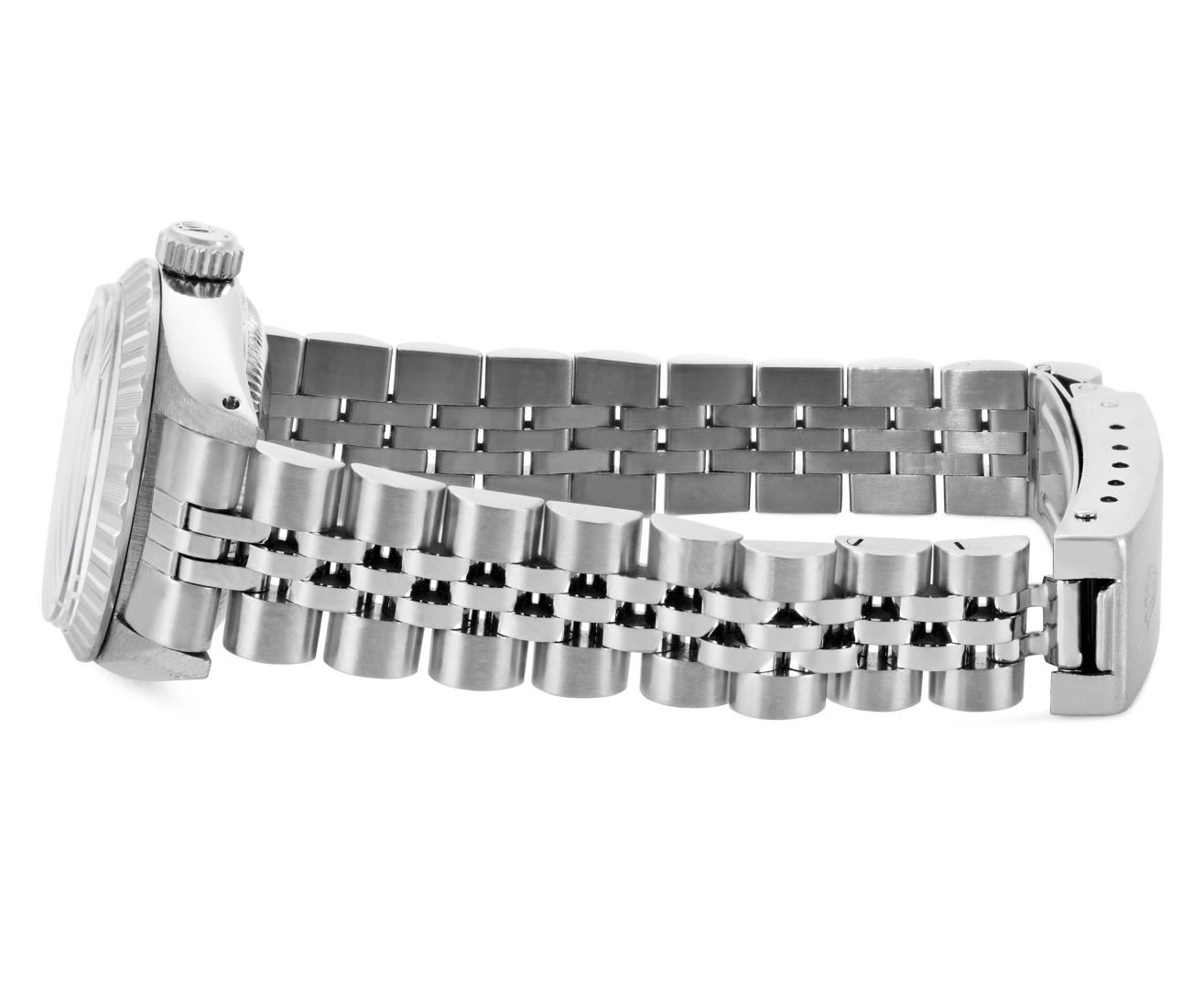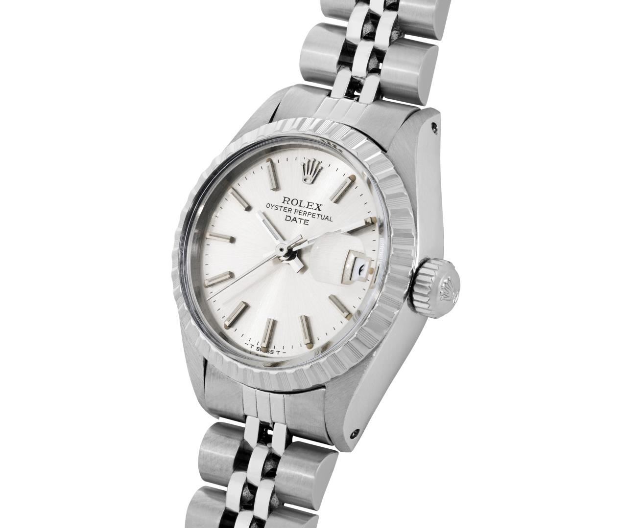One Rolex Ladies Pre Owned Stainless Steel Date Wristwatch Polished Bright with Satin Finish, Serviced & Electronically Tested, Stainless Steel Case: 26mm, Stainless Steel Crown, Stainless Steel Engine Turn Bezel, Custom Crystal: New Acrylic With Magnifying Date Window. Custom Hands: New Luminescent Hands. Rolex Movement: Automatic Winding Movement 2035. Rolex Dial: Factory Silver With Index Hour Markers And Lumi Dots. Date Window: 3 O'Clock Position Date Display, Model: Date. Condition: G-6 Extra Fine. Rolex Bracelet: Stainless Steel Jubilee Band. Bright Polish & Satin Finish. 6.0 Inch Length, Adjustable. Standard Clasp, With Rolex Logo. This Watch Has Been Serviced Time Tested And Is In Excellent Condition. It Is Free Of All Scratches And Dents. This Watch Comes With A Rolex Box.