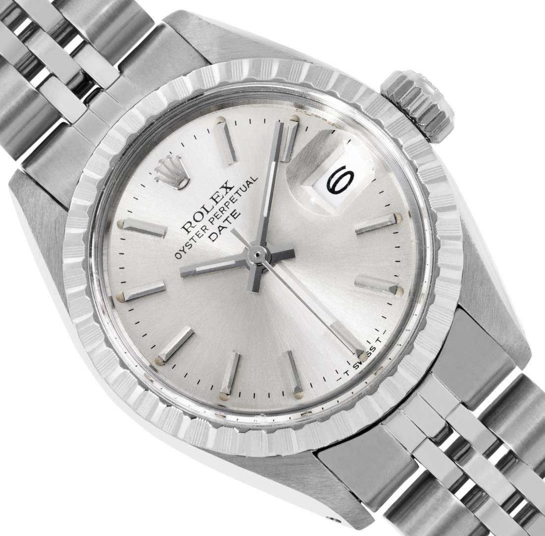 One Rolex Ladies Pre Owned Stainless Steel Date Wristwatch Polished Bright with Satin Finish, Serviced & Electronically Tested, Stainless Steel Case: 26mm, Stainless Steel Crown, Stainless Steel Engine Turn Bezel, Custom Crystal: New Acrylic With Magnifying Date Window. Custom Hands: New Luminescent Hands. Rolex Movement: Automatic Winding Movement 2035. Rolex Dial: Factory Silver With Index Hour Markers And Lumi Dots. Date Window: 3 O'Clock Position Date Display, Model: Date. Condition: G-6 Extra Fine. Rolex Bracelet: Stainless Steel Jubilee Band. Bright Polish & Satin Finish. 6.0 Inch Length, Adjustable. Standard Clasp, With Rolex Logo. This Watch Has Been Serviced Time Tested And Is In Excellent Condition. It Is Free Of All Scratches And Dents. This Watch Comes With A Rolex Box.