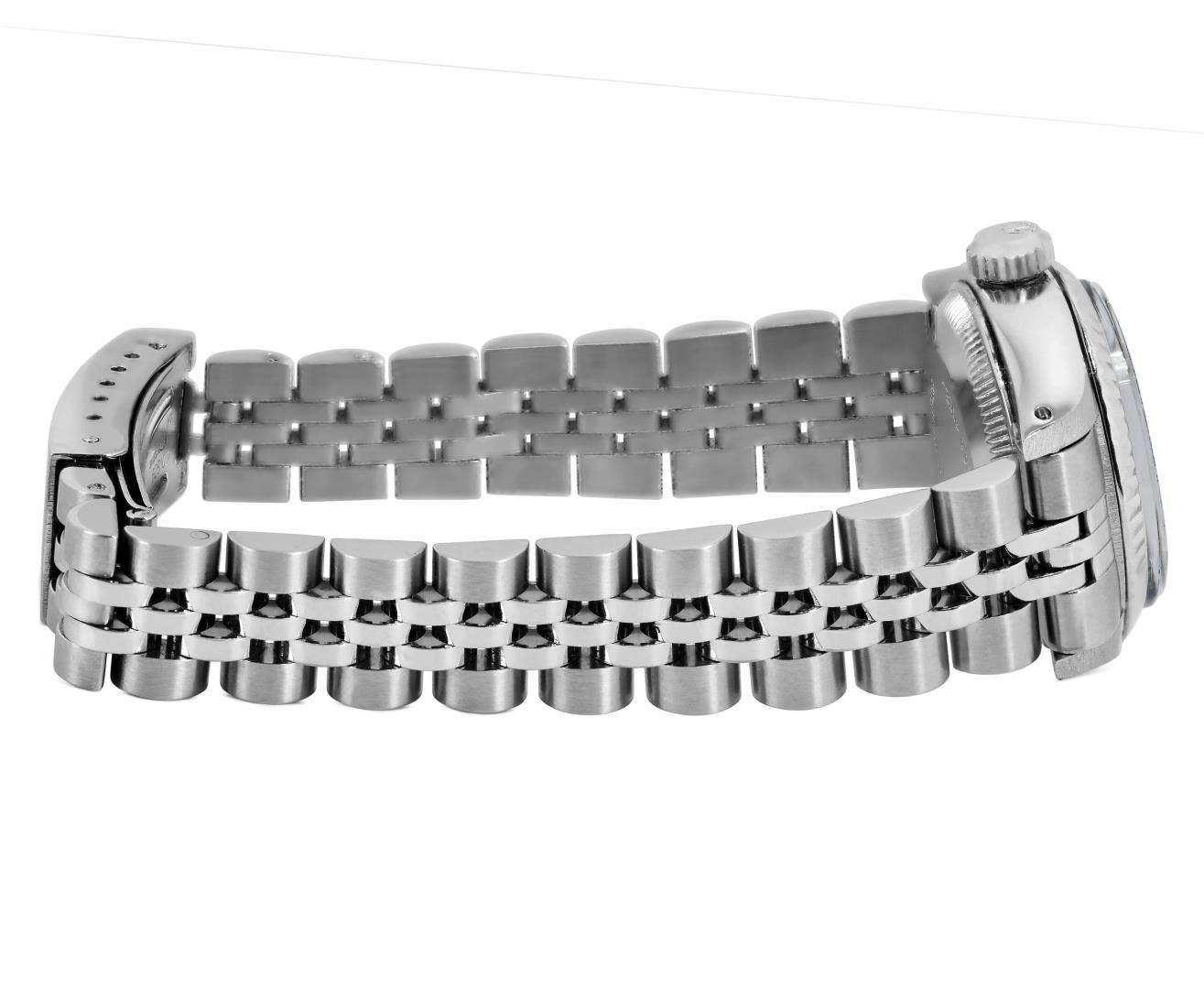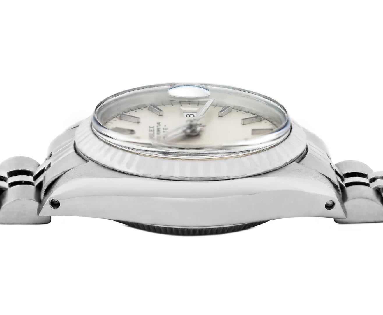 One Rolex Ladies Pre Owned Stainless Steel Date Wristwatch Polished Bright with Satin Finish, Serviced & Electronically Tested, Stainless Steel Case: 26mm, Stainless Steel Crown, 14K White Gold Fluted Bezel, Custom Crystal: New Acrylic With Magnifying Date Window. Custom Hands: New Luminescent Hands. Rolex Movement: Automatic Winding Movement 2035. Rolex Dial: Factory Silver With Index Hour Markers And Lumi Dots. Date Window: 3 O'Clock Position Date Display, Model: Date. Condition: G-6 Extra Fine. Rolex Bracelet: Stainless Steel Jubilee Band. Bright Polish And Satin Finish. 6.0 Inch Length, Adjustable. Standard Clasp, With Rolex Logo. This Watch Has Been Serviced Time Tested And Is In Excellent Condition. It Is Free Of All Scratches And Dents. This Watch Comes With A Rolex Box.