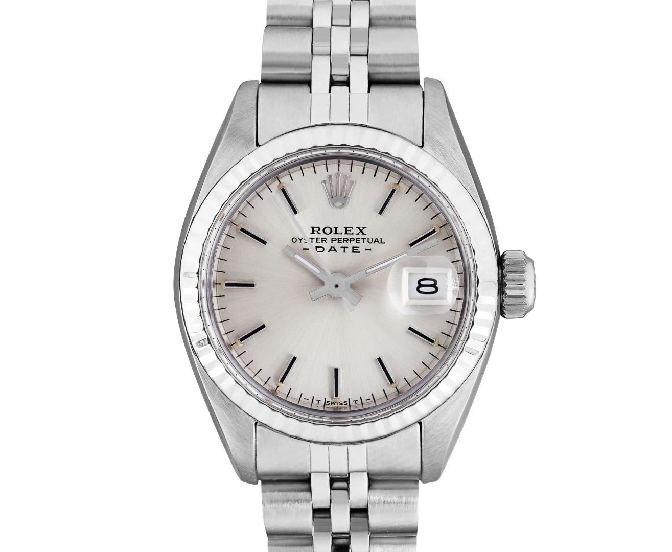 One Rolex Ladies Pre Owned Stainless Steel Date Wristwatch Polished Bright with Satin Finish, Serviced & Electronically Tested, Stainless Steel Case: 26mm, Stainless Steel Crown, 14K White Gold Fluted Bezel, Custom Crystal: New Acrylic With Magnifying Date Window. Custom Hands: New Luminescent Hands. Rolex Movement: Automatic Winding Movement 2035. Rolex Dial: Factory Silver With Index Hour Markers And Lumi Dots. Date Window: 3 O'Clock Position Date Display, Model: Date. Condition: G-6 Extra Fine. Rolex Bracelet: Stainless Steel Jubilee Band. Bright Polish And Satin Finish. 6.0 Inch Length, Adjustable. Standard Clasp, With Rolex Logo. This Watch Has Been Serviced Time Tested And Is In Excellent Condition. It Is Free Of All Scratches And Dents. This Watch Comes With A Rolex Box.