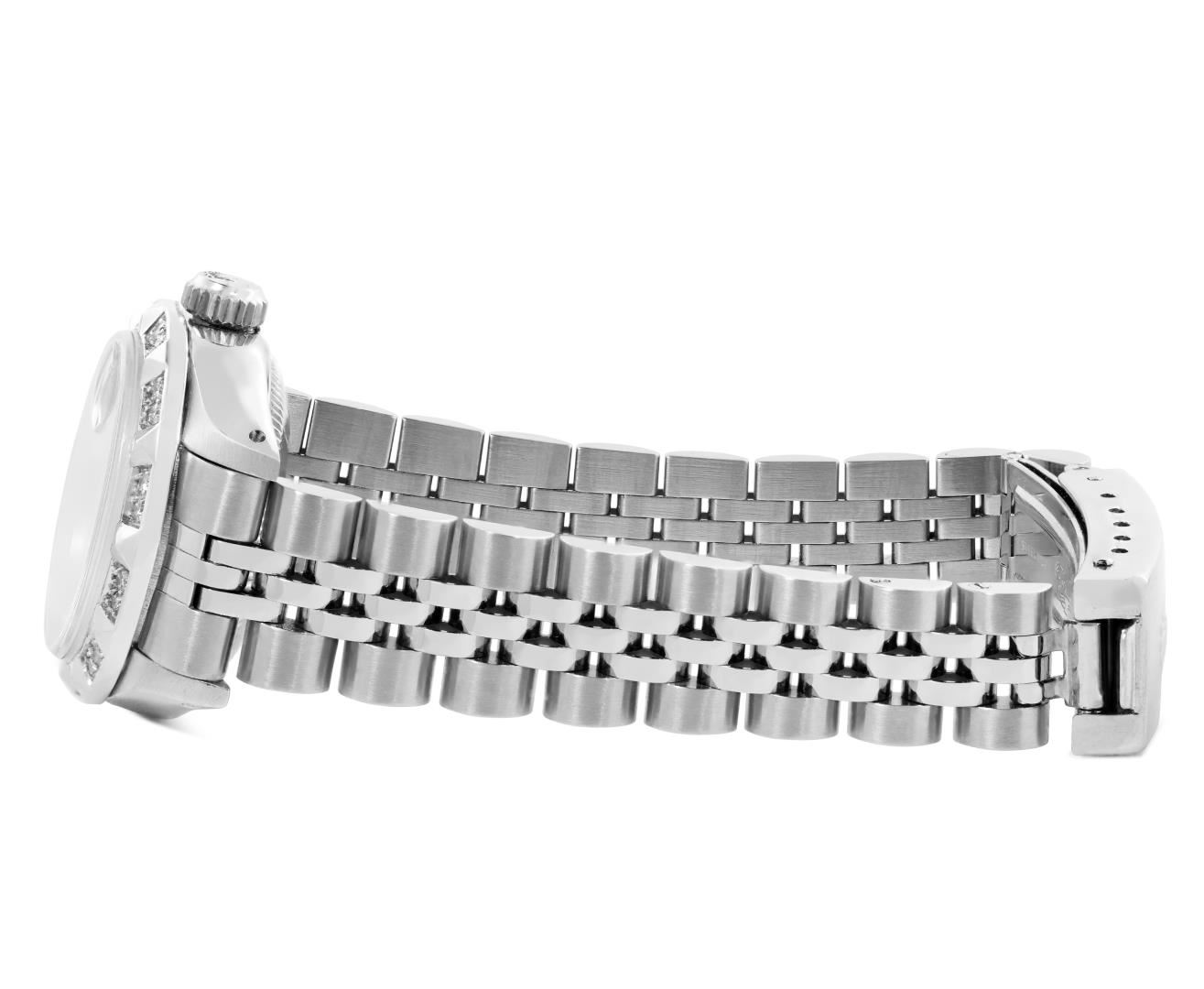 One Rolex Ladies Pre Owned Stainless Steel Date Wristwatch Polished Bright with Satin Finish, Serviced & Electronically Tested, Stainless Steel Case: 26mm, Stainless Steel Crown, Custom Bezel: New 18K White Gold Pyramid Diamond Bezel, Diamond Count: 24 Diamonds On Bezel. Custom Crystal: New Sapphire With Magnified Date Window. Custom Hands: New Luminescent Hands. Rolex Movement: Automatic Winding Movement 2035. Rolex Dial: Factory Silver With Index Hour Markers And Lumi Dots. Date Window: 3 O'Clock Position Date Display, Model: Date. Condition: G-6 Extra Fine. Rolex Bracelet: Stainless Steel Jubilee Band. Bright Polish & Satin Finish. 6.0 Inch Length, Adjustable. Standard Clasp, With Rolex Logo. This Watch Has Been Serviced Time Tested And Is In Excellent Condition. It Is Free Of All Scratches And Dents.