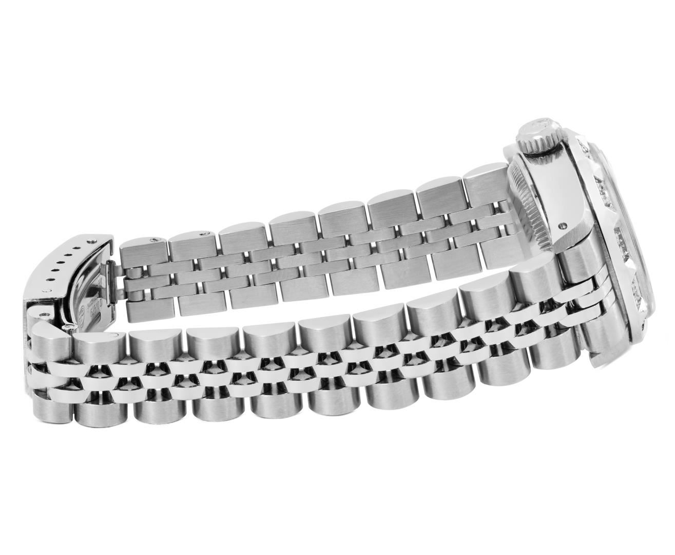 One Rolex Ladies Pre Owned Stainless Steel Date Wristwatch Polished Bright with Satin Finish, Serviced & Electronically Tested, Stainless Steel Case: 26mm, Stainless Steel Crown, Custom Bezel: New 18K White Gold Pyramid Diamond Bezel, Diamond Count: 24 Diamonds On Bezel. Custom Crystal: New Sapphire With Magnified Date Window. Custom Hands: New Luminescent Hands. Rolex Movement: Automatic Winding Movement 2035. Rolex Dial: Factory Silver With Index Hour Markers And Lumi Dots. Date Window: 3 O'Clock Position Date Display, Model: Date. Condition: G-6 Extra Fine. Rolex Bracelet: Stainless Steel Jubilee Band. Bright Polish & Satin Finish. 6.0 Inch Length, Adjustable. Standard Clasp, With Rolex Logo. This Watch Has Been Serviced Time Tested And Is In Excellent Condition. It Is Free Of All Scratches And Dents.