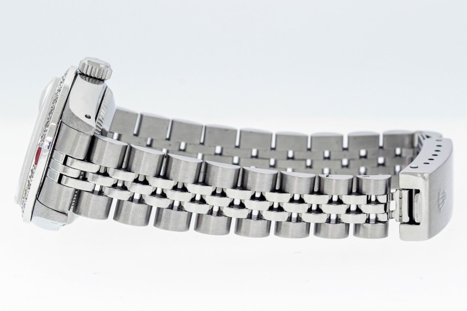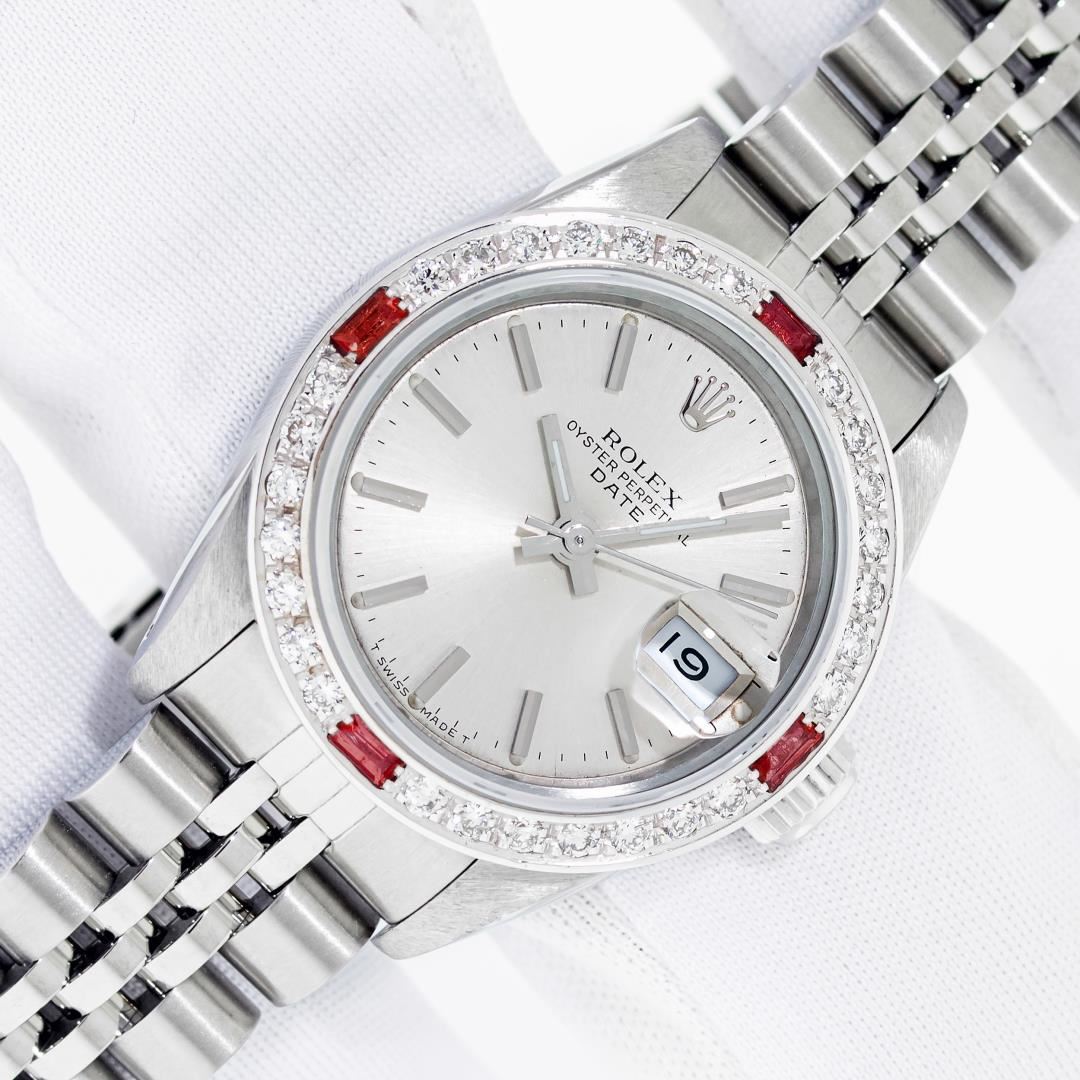 One Ladies Pre Owned Quickset Stainless Steel Rolex Date Polished Bright with Satin Finish Serviced & Electronically Tested, Rolex Stainless Steel Case: 26mm, Rolex Stainless Steel Crown, Custom Bezel: New White Gold Beadset + Ruby Diamond Bezel, Diamond Count: 28 Diamonds + 4 Rubies. Custom Crystal: New Sapphire With Date Window. Custom Hands: New Luminescent Hands. Rolex Movement: Automatic Winding Movement. Rolex Dial: Silver Index Dial With Dash Track And Lumi Dot. Date Window: 3 O'Clock Position Date Display, Model: Datejust. Condition: G-6 Extra Fine. Rolex Bracelet: Stainless Steel Jubilee Band With Rolex Crown On Buckle. Bright Polish & Satin Finish. Band Length: 6.0 Inch Length, Adjustable. Standard Clasp, With Rolex Logo. This Watch Has Been Serviced Time Tested And Is In Excellent Condition It Is Free Of All Scratches And Dents.
