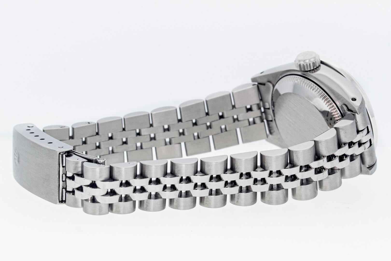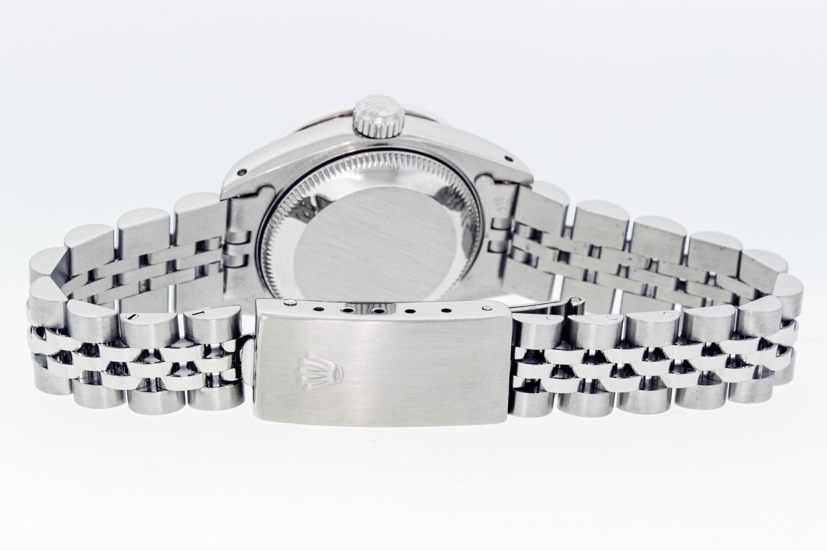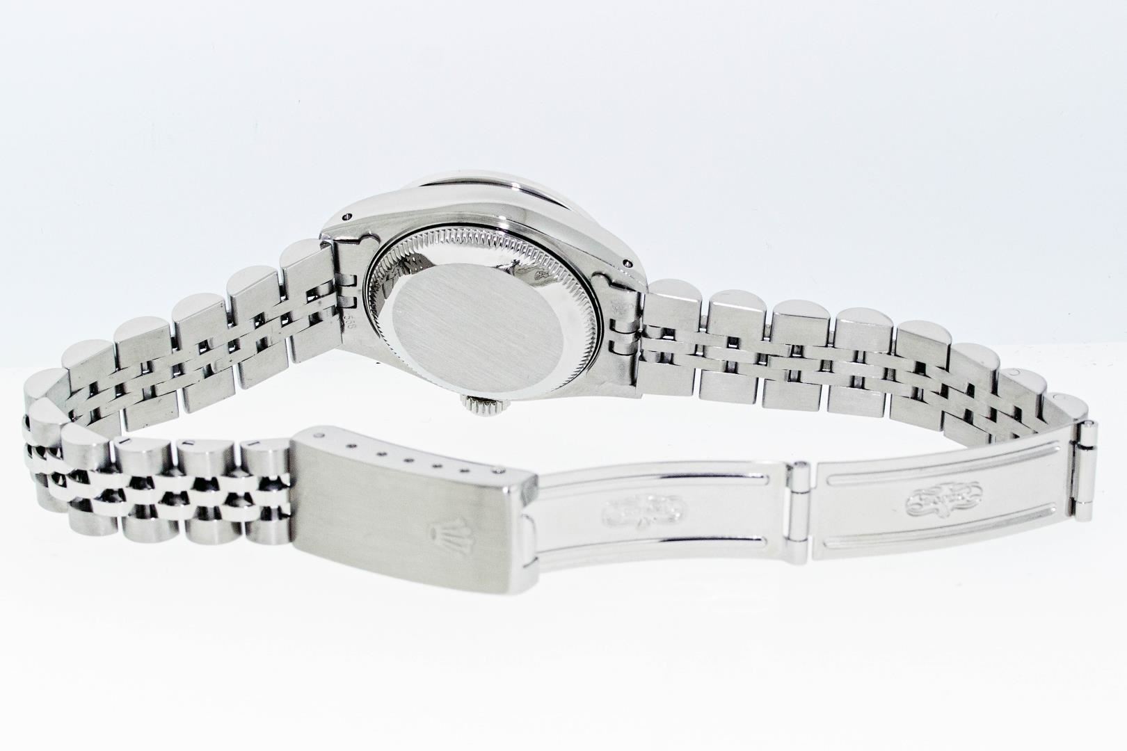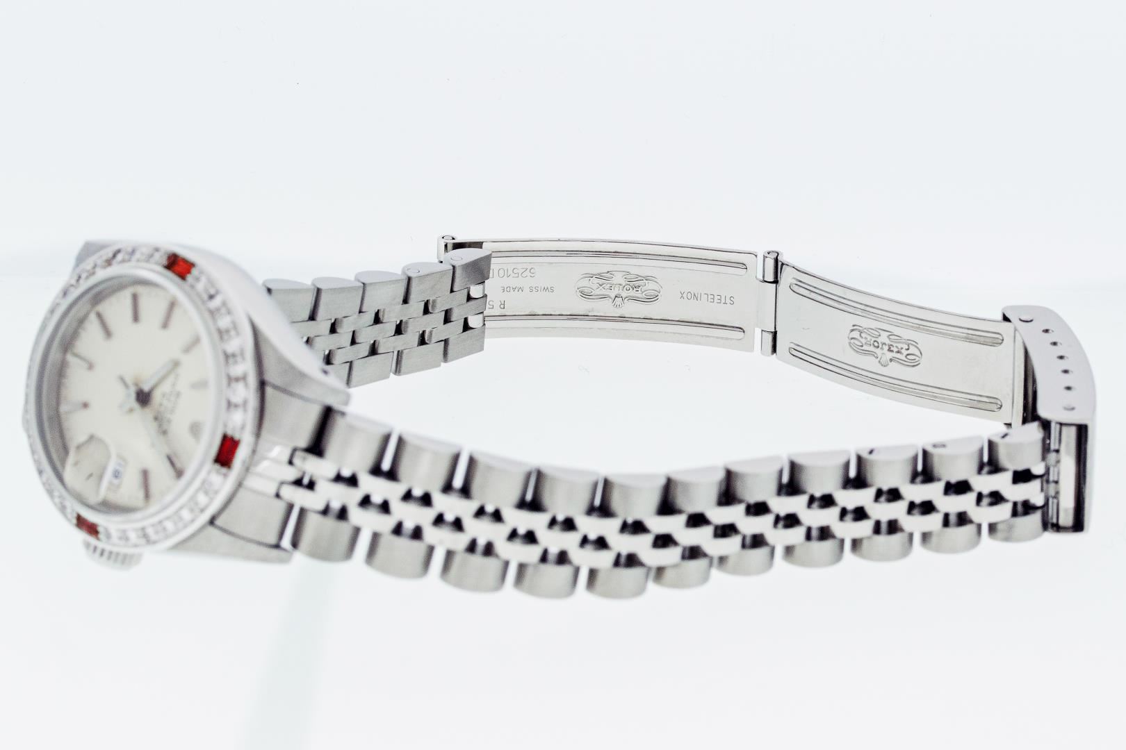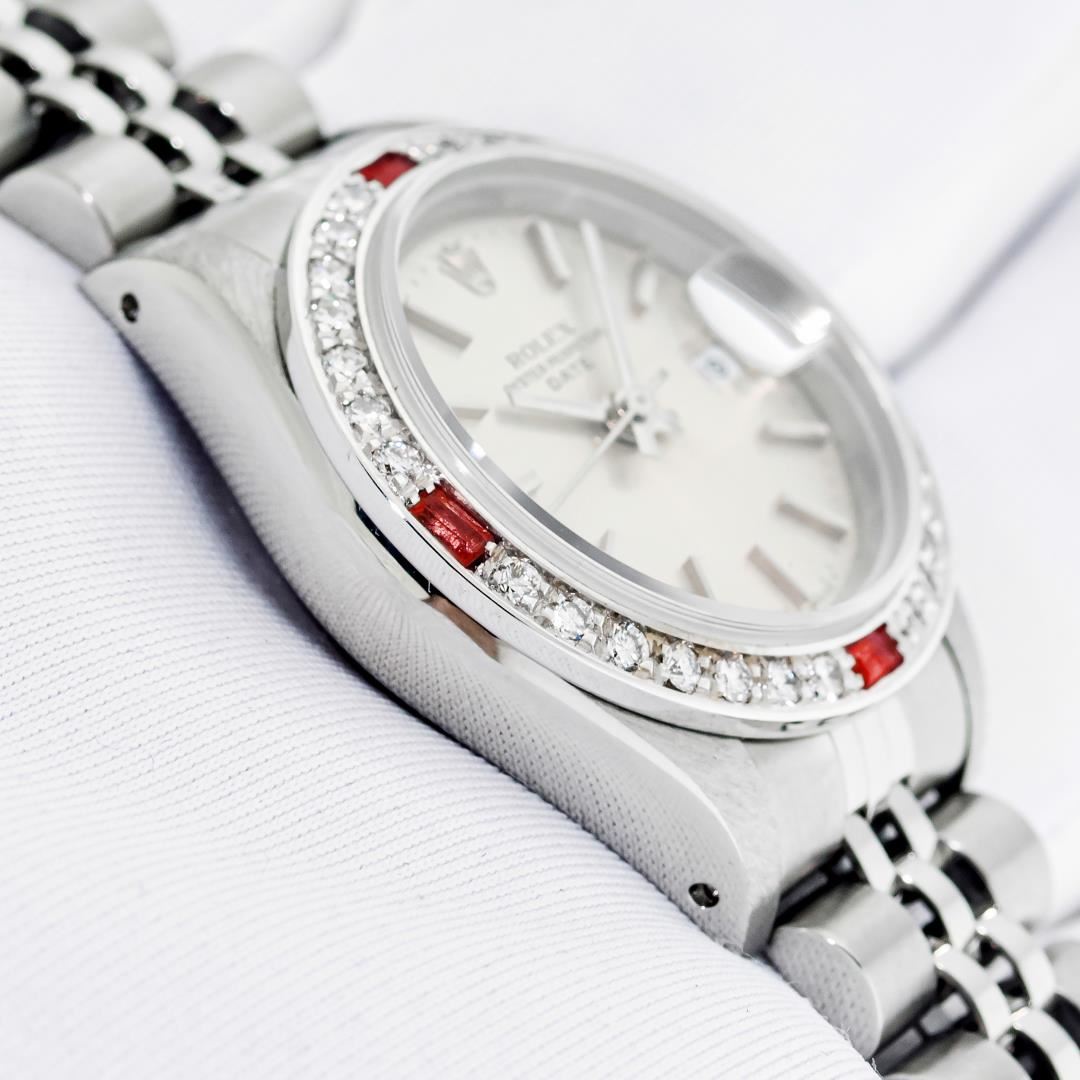 One Ladies Pre Owned Quickset Stainless Steel Rolex Date Polished Bright with Satin Finish Serviced & Electronically Tested, Rolex Stainless Steel Case: 26mm, Rolex Stainless Steel Crown, Custom Bezel: New White Gold Beadset + Ruby Diamond Bezel, Diamond Count: 28 Diamonds + 4 Rubies. Custom Crystal: New Sapphire With Date Window. Custom Hands: New Luminescent Hands. Rolex Movement: Automatic Winding Movement. Rolex Dial: Silver Index Dial With Dash Track And Lumi Dot. Date Window: 3 O'Clock Position Date Display, Model: Datejust. Condition: G-6 Extra Fine. Rolex Bracelet: Stainless Steel Jubilee Band With Rolex Crown On Buckle. Bright Polish & Satin Finish. Band Length: 6.0 Inch Length, Adjustable. Standard Clasp, With Rolex Logo. This Watch Has Been Serviced Time Tested And Is In Excellent Condition It Is Free Of All Scratches And Dents.