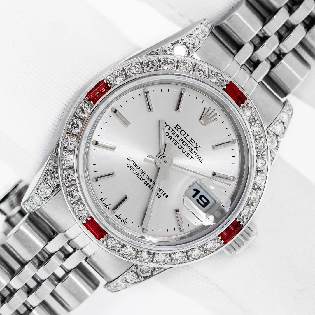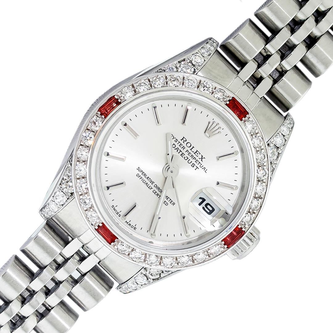 One Ladies Pre Owned Quickset Stainless Steel Rolex Datejust Polished Bright with Satin Finish, Serviced & Electronically Tested, Stainless Steel Case: 26mm, Custom Diamond Lugs: Added Diamonds On Lugs, Diamond Count: 24 Diamonds Color: G To H, Clartity: SI-VS. Rolex Stainless Steel Crown, Custom Bezel: New 18K White Gold Ruby Bead Set Diamond Bezel, Diamond + Gem Count: 28 Diamonds + 4 Rubies, Clarity: SI-VS, Color: G to H. Custom Crystal: New Sapphire With Magnified Date Window. Custom Hands: New Luminescent Hands. Rolex Movement: Automatic Winding Movement 2235. Rolex Dial: Silver With Index Hour Markers With Dash Track & Lumi Dot. Date Window: 3 O'Clock Position Date Display, Model: Quickset Datejust. Condition: G-6 Extra Fine. Rolex Bracelet: Stainless Steel Jubilee Band. Bright Polish & Satin Finish. 6.0 Inch Length, Adjustable. Standard Clasp, With Rolex Logo. This Watch Has Been Serviced Time Tested And Is In Excellent Condition It Is Free Of All Scratches And Dents.