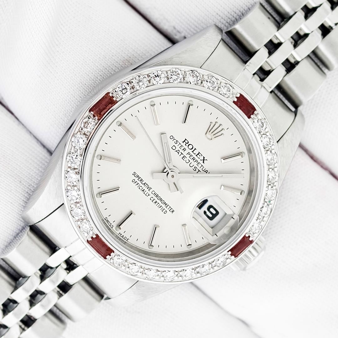 One Ladies Pre Owned Quickset Stainless Steel Rolex Datejust Polished Bright with Satin Finish, Serviced & Electronically Tested, Stainless Steel Case: 26mm, Rolex Stainless Steel Crown, Custom Bezel: New 18K White Gold Ruby Bead Set Diamond Bezel, Diamond + Gem Count: 28 Diamonds + 4 Rubies, Clarity: SI-VS, Color: G to H. Custom Crystal: New Sapphire With Magnified Date Window. Custom Hands: New Luminescent Hands. Rolex Movement: Automatic Winding Movement 2235. Rolex Dial: Silver With Index Hour Markers With Dash Track & Lumi Dot. Date Window: 3 O'Clock Position Date Display, Model: Quickset Datejust. Condition: G-6 Extra Fine. Rolex Bracelet: Stainless Steel Jubilee Band. Bright Polish & Satin Finish. 6.0 Inch Length, Adjustable. Standard Clasp, With Rolex Logo. This Watch Has Been Serviced Time Tested And Is In Excellent Condition It Is Free Of All Scratches And Dents.