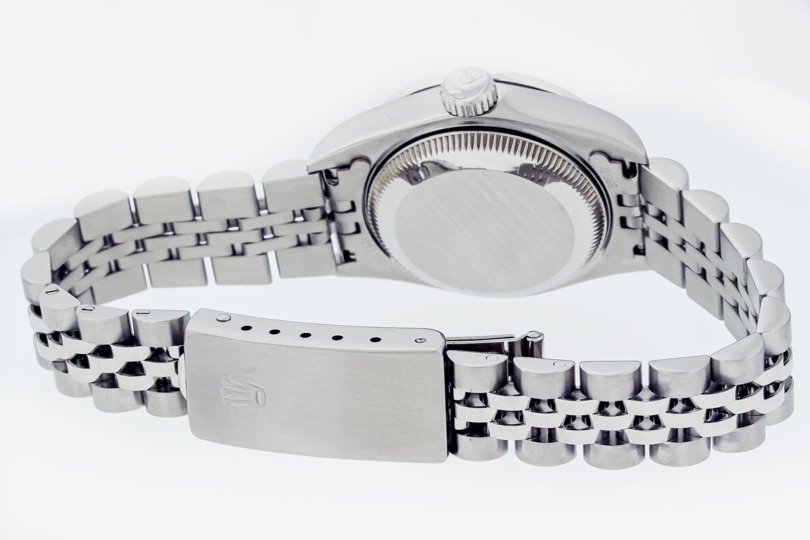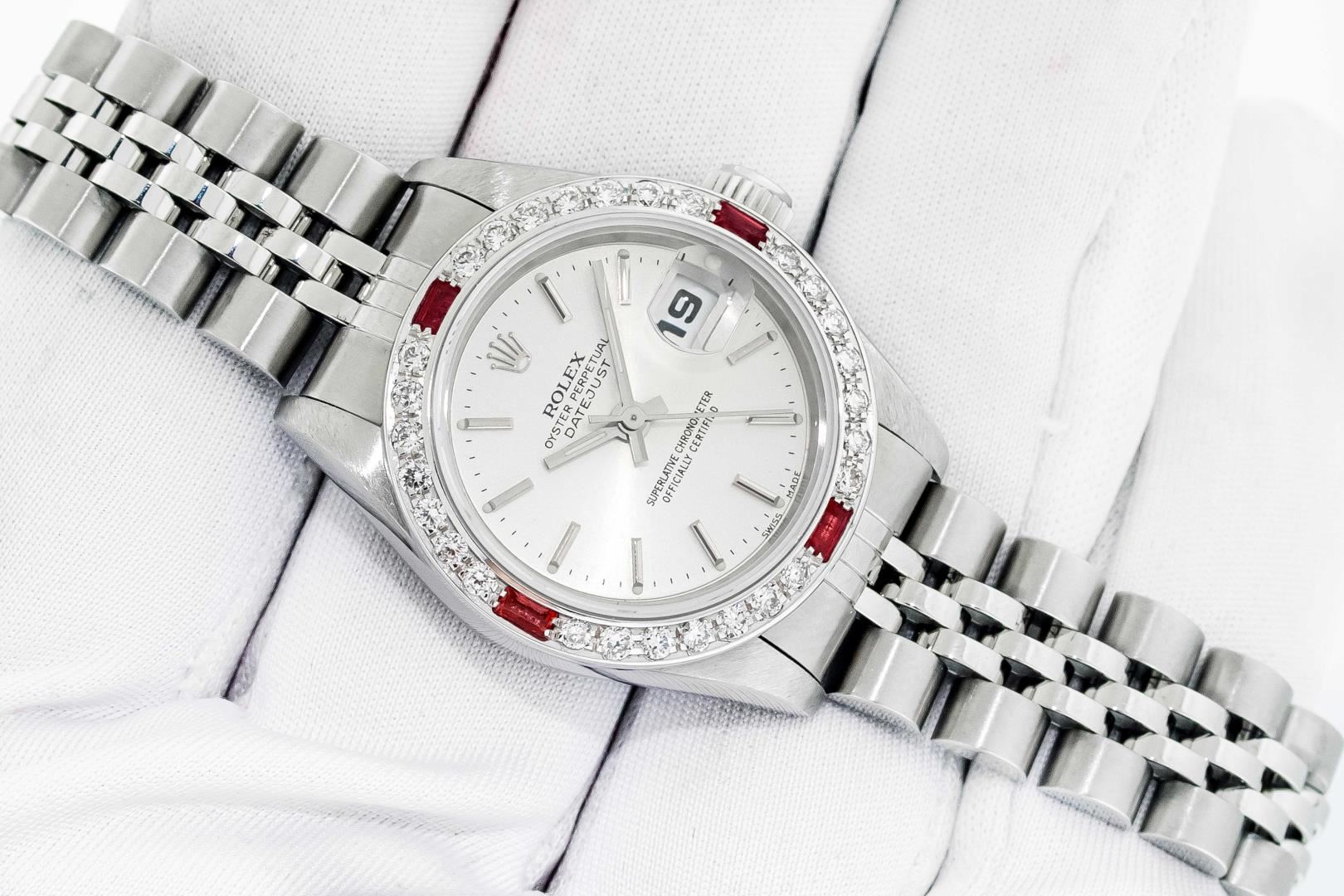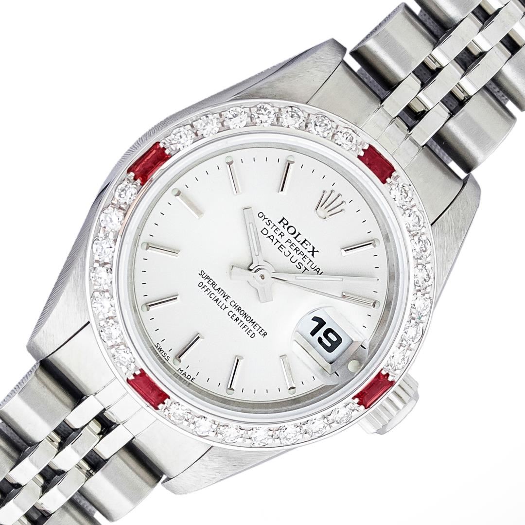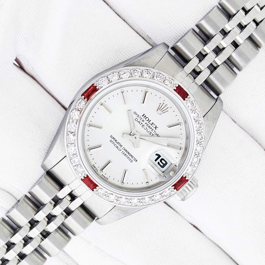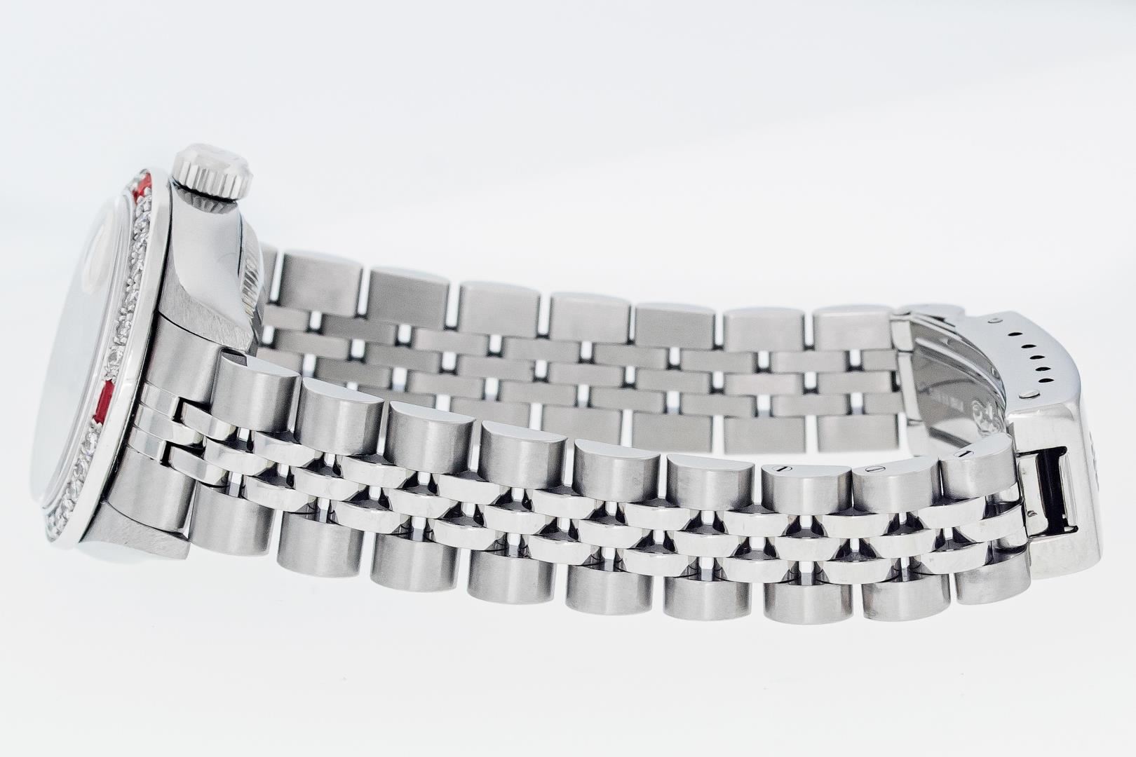One Ladies Pre Owned Quickset Stainless Steel Rolex Datejust Polished Bright with Satin Finish, Serviced & Electronically Tested, Stainless Steel Case: 26mm, Rolex Stainless Steel Crown, Custom Bezel: New 18K White Gold Ruby Bead Set Diamond Bezel, Diamond + Gem Count: 28 Diamonds + 4 Rubies, Clarity: SI-VS, Color: G to H. Custom Crystal: New Sapphire With Magnified Date Window. Custom Hands: New Luminescent Hands. Rolex Movement: Automatic Winding Movement 2235. Rolex Dial: Silver With Index Hour Markers With Dash Track & Lumi Dot. Date Window: 3 O'Clock Position Date Display, Model: Quickset Datejust. Condition: G-6 Extra Fine. Rolex Bracelet: Stainless Steel Jubilee Band. Bright Polish & Satin Finish. 6.0 Inch Length, Adjustable. Standard Clasp, With Rolex Logo. This Watch Has Been Serviced Time Tested And Is In Excellent Condition It Is Free Of All Scratches And Dents.