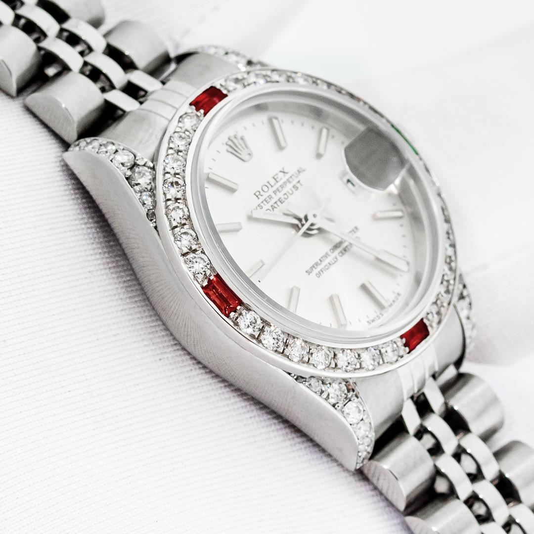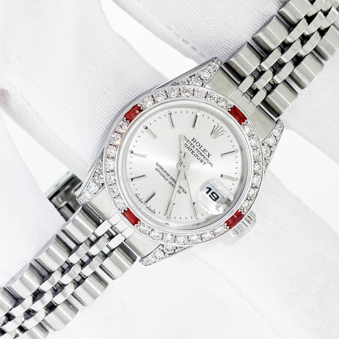 One Ladies Pre Owned Quickset Stainless Steel Rolex Datejust Polished Bright with Satin Finish, Serviced & Electronically Tested, Stainless Steel Case: 26mm, Custom Diamond Lugs: Added Diamonds On Lugs, Diamond Count: 24 Diamonds Color: G To H, Clartity: SI-VS. Rolex Stainless Steel Crown, Custom Bezel: New 18K White Gold Ruby Bead Set Diamond Bezel, Diamond + Gem Count: 28 Diamonds + 4 Rubies, Clarity: SI-VS, Color: G to H. Custom Crystal: New Sapphire With Magnified Date Window. Custom Hands: New Luminescent Hands. Rolex Movement: Automatic Winding Movement 2235. Rolex Dial: Silver With Index Hour Markers With Dash Track & Lumi Dot. Date Window: 3 O'Clock Position Date Display, Model: Quickset Datejust. Condition: G-6 Extra Fine. Rolex Bracelet: Stainless Steel Jubilee Band. Bright Polish & Satin Finish. 6.0 Inch Length, Adjustable. Standard Clasp, With Rolex Logo. This Watch Has Been Serviced Time Tested And Is In Excellent Condition It Is Free Of All Scratches And Dents.