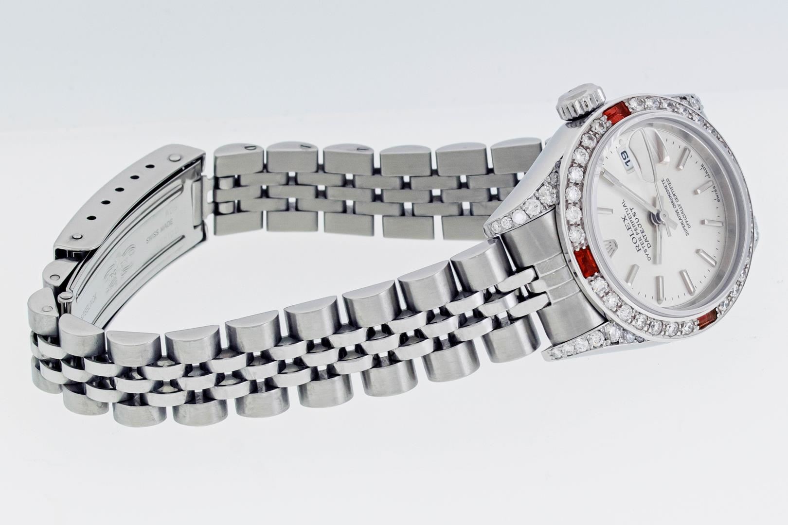 One Ladies Pre Owned Quickset Stainless Steel Rolex Datejust Polished Bright with Satin Finish, Serviced & Electronically Tested, Stainless Steel Case: 26mm, Custom Diamond Lugs: Added Diamonds On Lugs, Diamond Count: 24 Diamonds Color: G To H, Clartity: SI-VS. Rolex Stainless Steel Crown, Custom Bezel: New 18K White Gold Ruby Bead Set Diamond Bezel, Diamond + Gem Count: 28 Diamonds + 4 Rubies, Clarity: SI-VS, Color: G to H. Custom Crystal: New Sapphire With Magnified Date Window. Custom Hands: New Luminescent Hands. Rolex Movement: Automatic Winding Movement 2235. Rolex Dial: Silver With Index Hour Markers With Dash Track & Lumi Dot. Date Window: 3 O'Clock Position Date Display, Model: Quickset Datejust. Condition: G-6 Extra Fine. Rolex Bracelet: Stainless Steel Jubilee Band. Bright Polish & Satin Finish. 6.0 Inch Length, Adjustable. Standard Clasp, With Rolex Logo. This Watch Has Been Serviced Time Tested And Is In Excellent Condition It Is Free Of All Scratches And Dents.