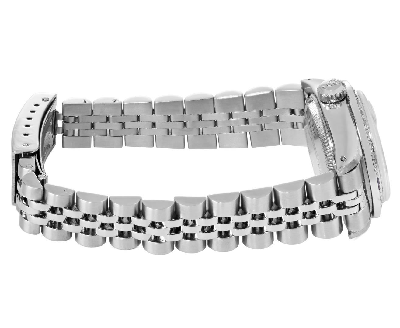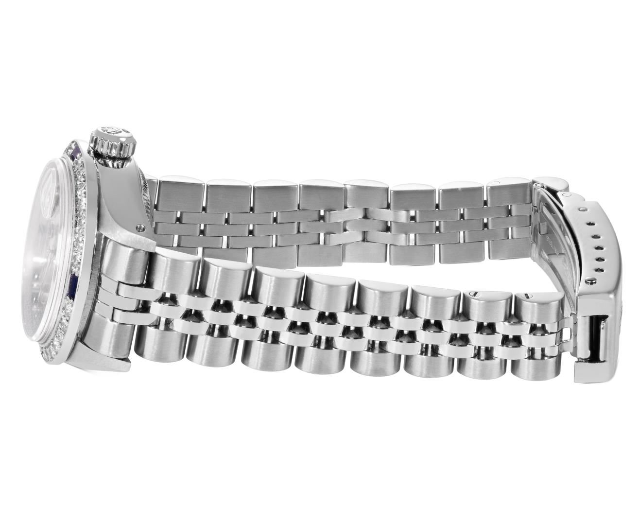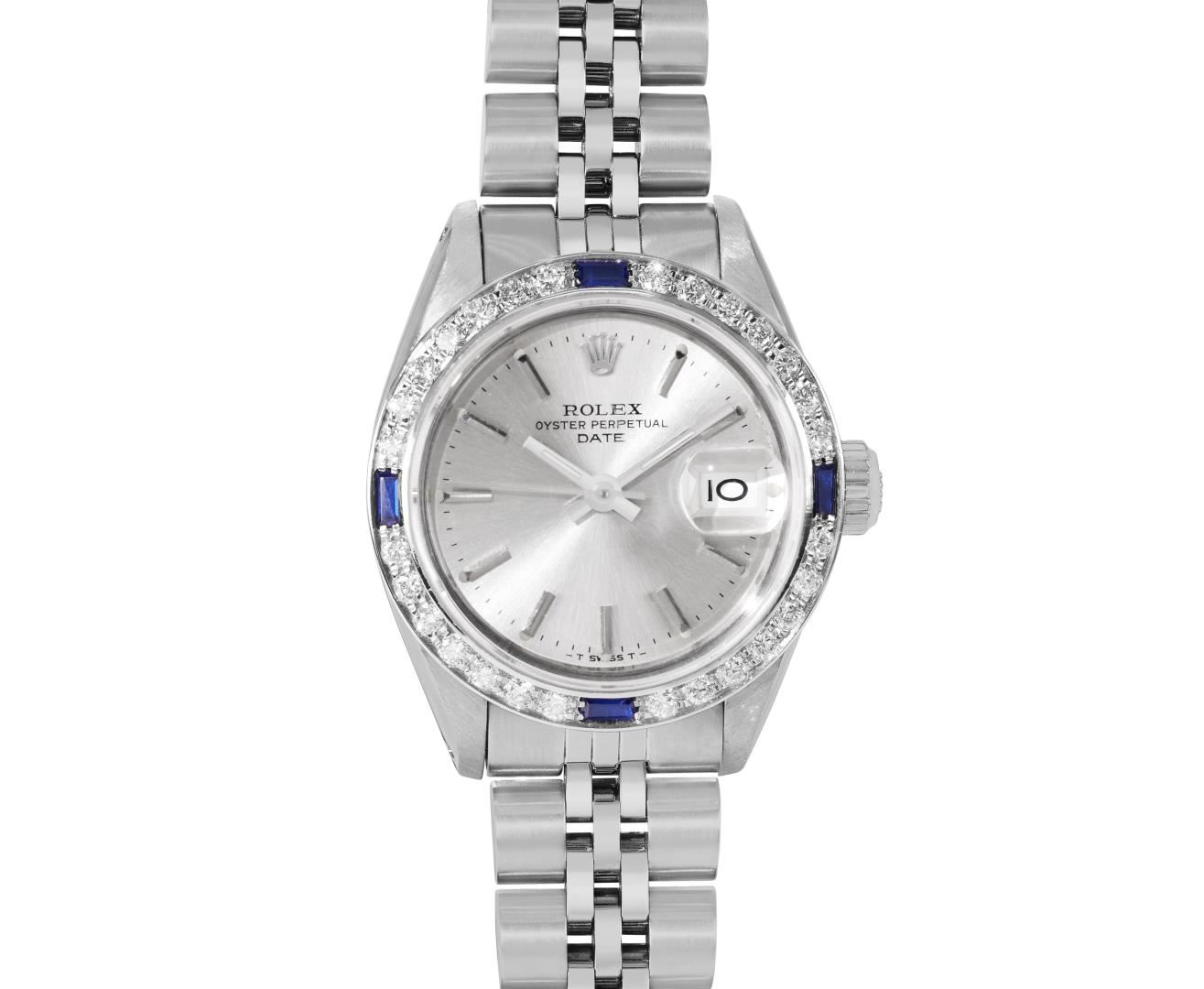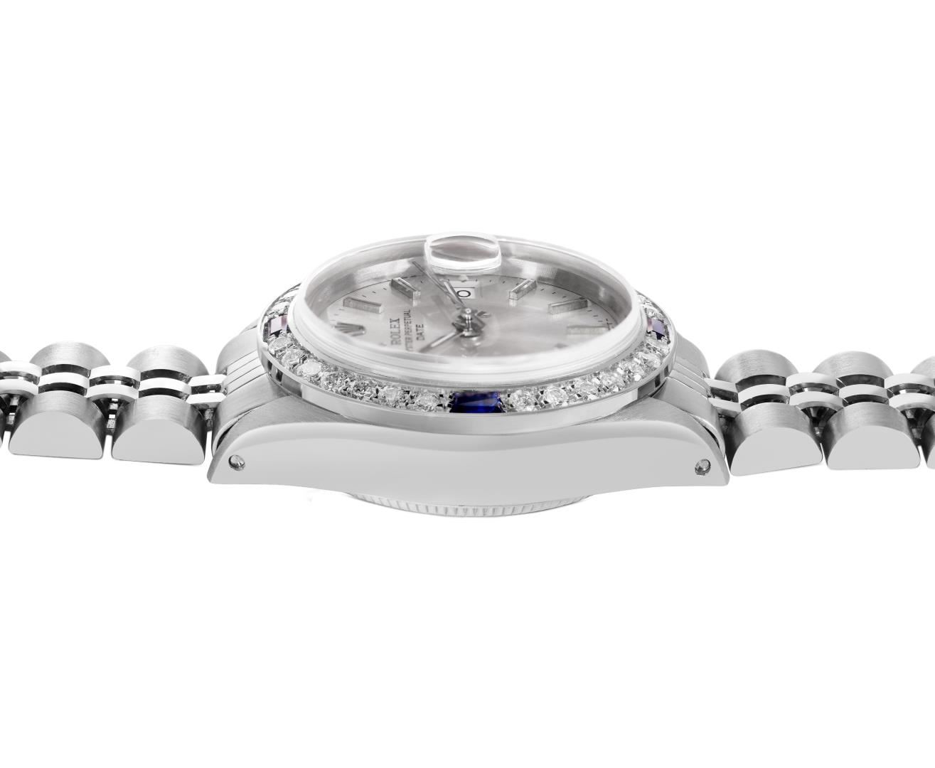 One Rolex Ladies Pre Owned Stainless Steel Date Wristwatch Polished Bright with Satin Finish, Serviced & Electronically Tested, Stainless Steel Case: 26mm, Stainless Steel Crown, Custom Bezel: New 18K White Gold Sapphire Beadset Diamond Bezel, Diamond + Gem Count: 36 Diamonds + 4 Sapphires, Clarity: SI-VS, Color: G to H. Custom Crystal: New Sapphire With Magnified Date Window. Custom Hands: New Luminescent Hands. Rolex Movement: Automatic Winding Movement 2035. Rolex Dial: Factory Silver With Index Hour Markers and Lumi Markers, Dash Track, and Lumi Dots. Date Window: 3 O'clock Position Date Display, Model: Date. Condition: G-6 Extra Fine. Rolex Bracelet: Stainless Steel Jubilee Band. Bright Polish & Satin Finish. 6.0 Inch Length, Adjustable. Standard Clasp, With Rolex Logo. This Watch Has Been Serviced Time Tested And Is In Excellent Condition. It Is Free Of All Scratches And Dents.