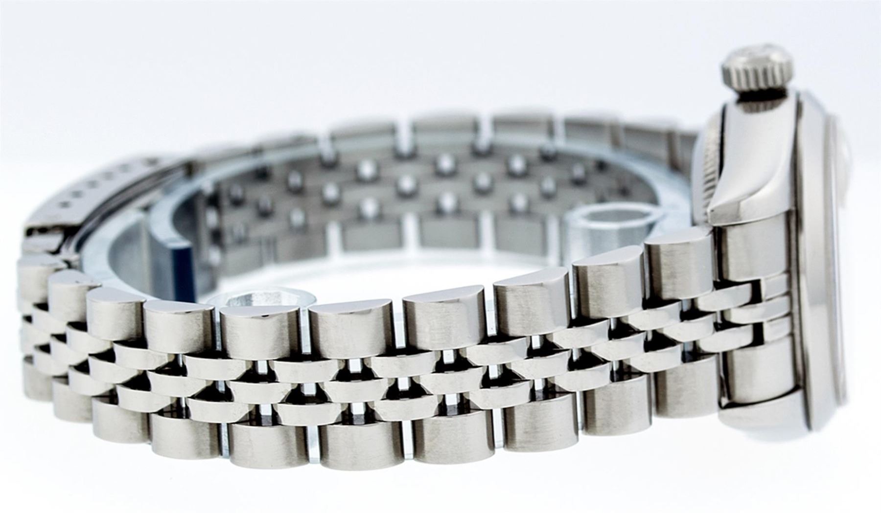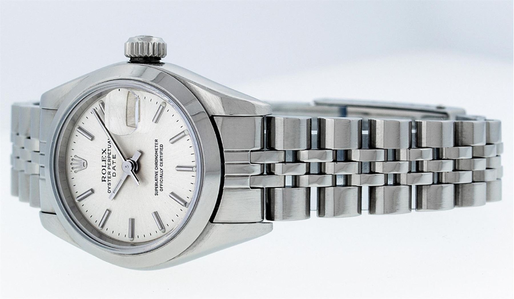 One Ladies Pre Owned Quickset Stainless Steel Rolex Date Polished Bright with Satin Finish, Serviced & Electronically Tested, Rolex Stainless Steel Case: 26mm, Rolex Stainless Steel Crown, Rolex Bezel: Stainless Steel Smooth Bezel. Crystal: Sapphire With Magnified Date Window. Hands: Luminescent Hands. Rolex Movement: Automatic Winding Movement 2230. Rolex Dial: Silver Index Dial With Luminescent Dots & Dash Track. Date Window: 3 O'Clock Position Date Display, Model: Quickset Datejust. Condition: G-6 Extra Fine. Rolex Bracelet: Stainless Steel Jubilee Band. Bright Polish & Satin Finish. 6.0 Inch Length, Adjustable. Standard Clasp, With Rolex Logo. This Watch Has Been Serviced Time Tested And Is In Excellent Condition It Is Free Of All Scratches And Dents.