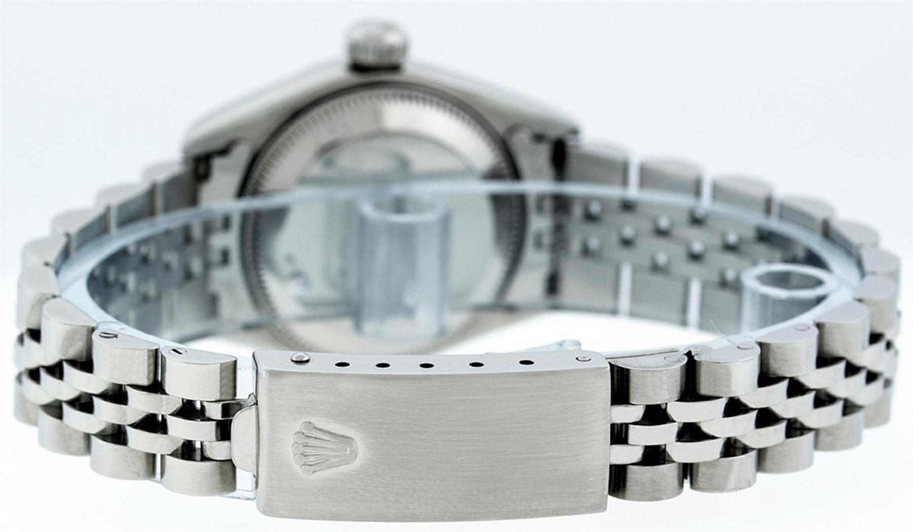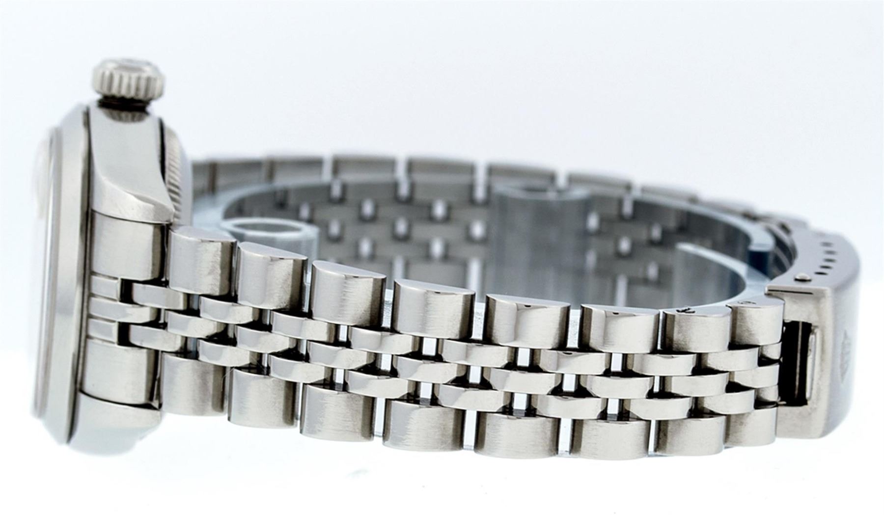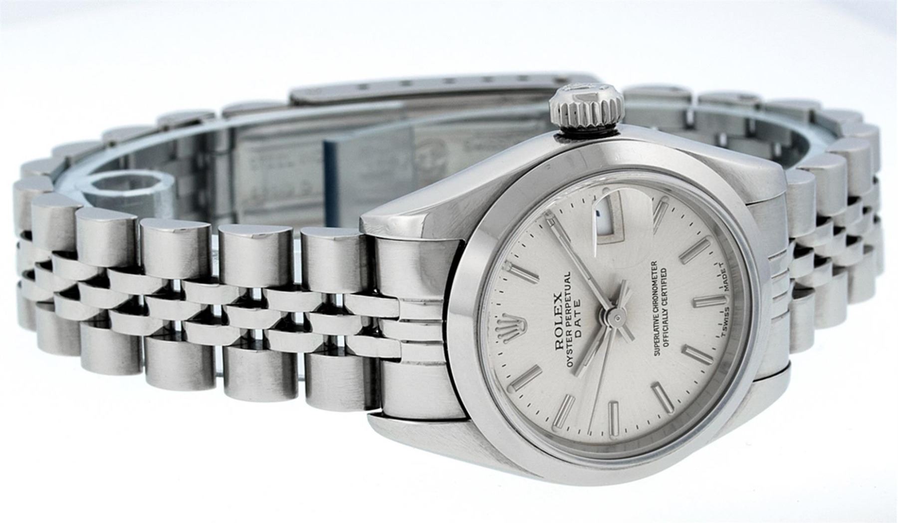 One Ladies Pre Owned Quickset Stainless Steel Rolex Date Polished Bright with Satin Finish, Serviced & Electronically Tested, Rolex Stainless Steel Case: 26mm, Rolex Stainless Steel Crown, Rolex Bezel: Stainless Steel Smooth Bezel. Crystal: Sapphire With Magnified Date Window. Hands: Luminescent Hands. Rolex Movement: Automatic Winding Movement 2230. Rolex Dial: Silver Index Dial With Luminescent Dots & Dash Track. Date Window: 3 O'Clock Position Date Display, Model: Quickset Datejust. Condition: G-6 Extra Fine. Rolex Bracelet: Stainless Steel Jubilee Band. Bright Polish & Satin Finish. 6.0 Inch Length, Adjustable. Standard Clasp, With Rolex Logo. This Watch Has Been Serviced Time Tested And Is In Excellent Condition It Is Free Of All Scratches And Dents.
