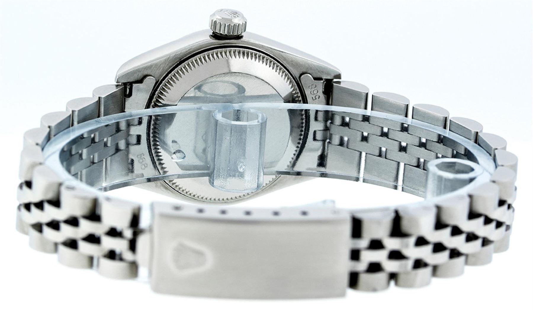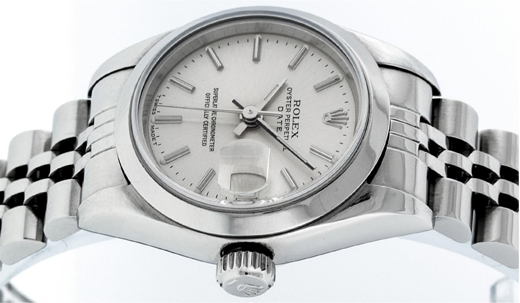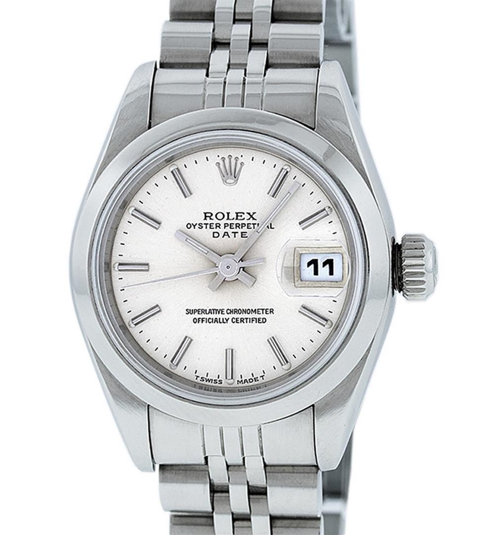 One Ladies Pre Owned Quickset Stainless Steel Rolex Date Polished Bright with Satin Finish, Serviced & Electronically Tested, Rolex Stainless Steel Case: 26mm, Rolex Stainless Steel Crown, Rolex Bezel: Stainless Steel Smooth Bezel. Crystal: Sapphire With Magnified Date Window. Hands: Luminescent Hands. Rolex Movement: Automatic Winding Movement 2230. Rolex Dial: Silver Index Dial With Luminescent Dots & Dash Track. Date Window: 3 O'Clock Position Date Display, Model: Quickset Datejust. Condition: G-6 Extra Fine. Rolex Bracelet: Stainless Steel Jubilee Band. Bright Polish & Satin Finish. 6.0 Inch Length, Adjustable. Standard Clasp, With Rolex Logo. This Watch Has Been Serviced Time Tested And Is In Excellent Condition It Is Free Of All Scratches And Dents.