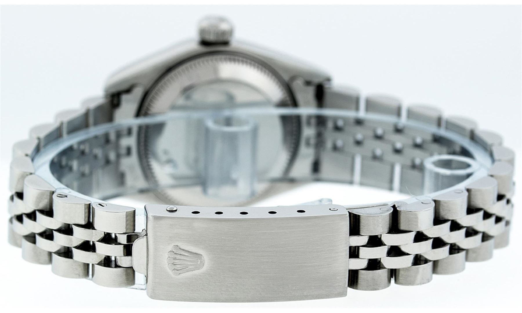 One Ladies Pre Owned Quickset Stainless Steel Rolex Date Polished Bright with Satin Finish, Serviced & Electronically Tested, Rolex Stainless Steel Case: 26mm, Rolex Stainless Steel Crown, Rolex Bezel: Stainless Steel Smooth Bezel. Crystal: Sapphire With Magnified Date Window. Hands: Luminescent Hands. Rolex Movement: Automatic Winding Movement 2230. Rolex Dial: Silver Index Dial With Luminescent Dots & Dash Track. Date Window: 3 O'Clock Position Date Display, Model: Quickset Datejust. Condition: G-6 Extra Fine. Rolex Bracelet: Stainless Steel Jubilee Band. Bright Polish & Satin Finish. 6.0 Inch Length, Adjustable. Standard Clasp, With Rolex Logo. This Watch Has Been Serviced Time Tested And Is In Excellent Condition It Is Free Of All Scratches And Dents.