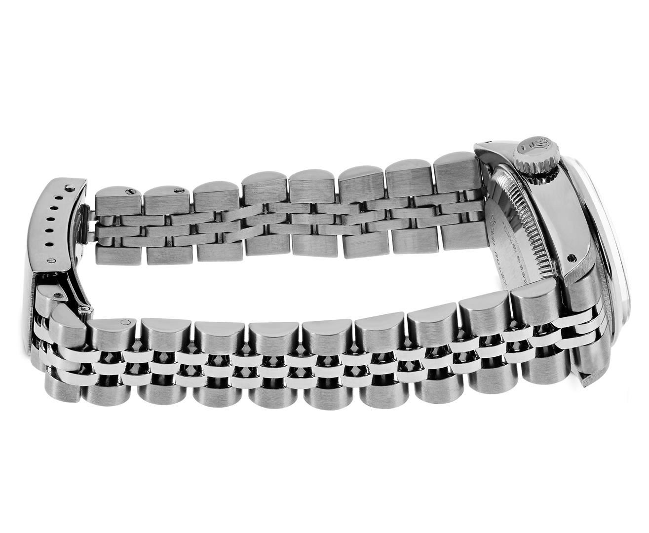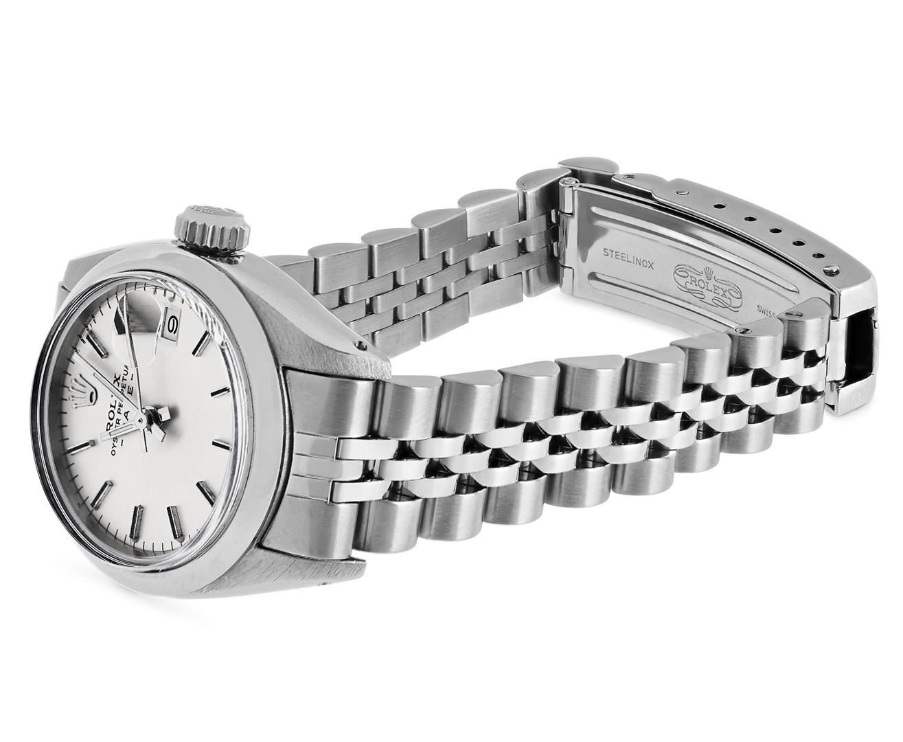One Rolex Ladies Pre Owned Stainless Steel Date Wristwatch Polished Bright with Satin Finish, Serviced & Electronically Tested, Stainless Steel Case: 26mm, Stainless Steel Crown, Stainless Steel Smooth Bezel, Custom Crystal: New Acrylic With Magnifying Da