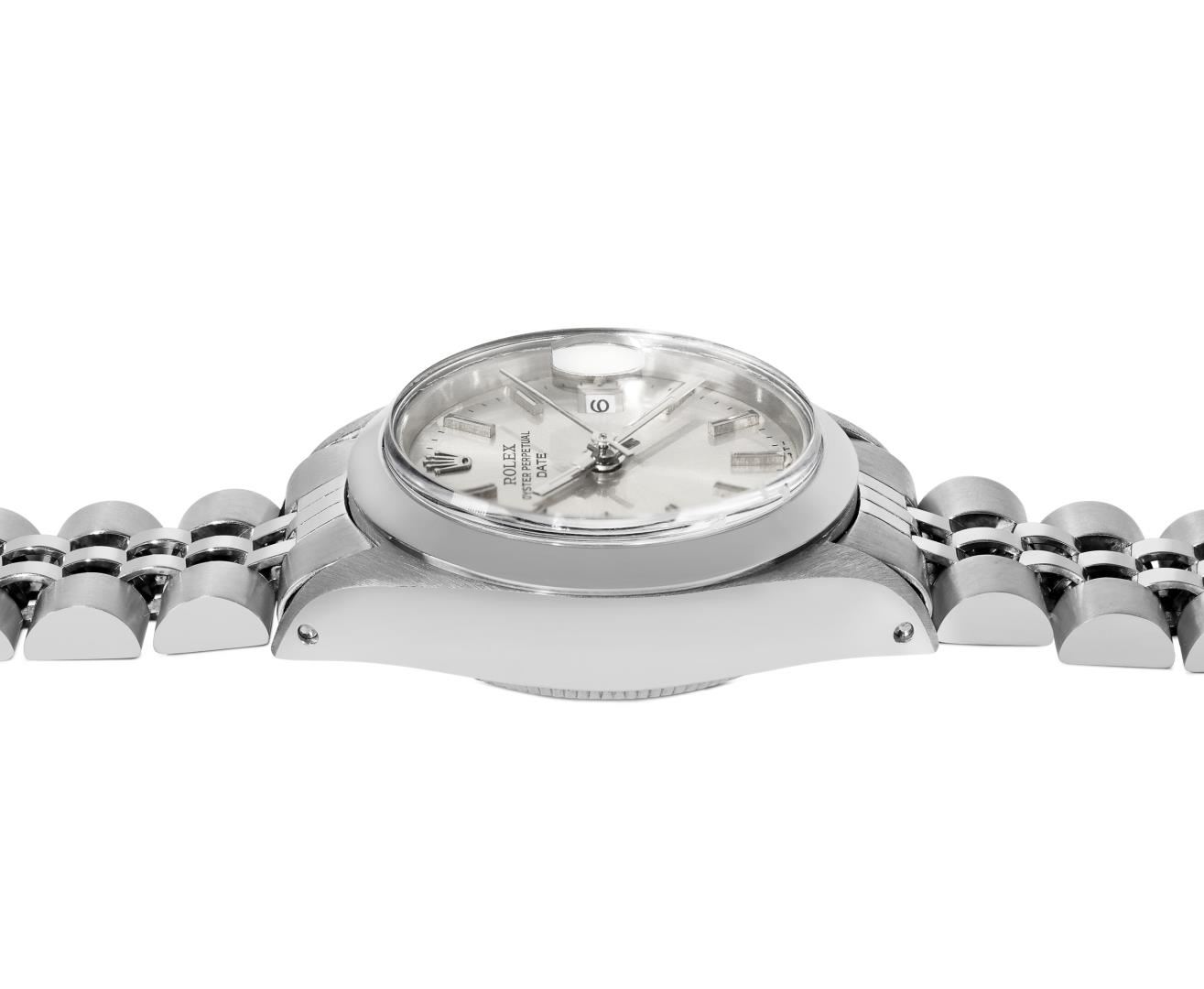 One Rolex Ladies Pre Owned Stainless Steel Date Wristwatch Polished Bright with Satin Finish, Serviced & Electronically Tested, Stainless Steel Case: 26mm, Stainless Steel Crown, Stainless Steel Smooth Bezel, Custom Crystal: New Acrylic With Magnifying Date Window. Custom Hands: New Luminescent Hands. Rolex Movement: Automatic Winding Movement 2035. Rolex Dial: Factory Silver With Index Hour Markers And Lumi Dots. Date Window: 3 O'Clock Position Date Display, Model: Date. Condition: G-6 Extra Fine. Rolex Bracelet: Stainless Steel Jubilee Band. Bright Polish & Satin Finish. 6.0 Inch Length, Adjustable. Standard Clasp, With Rolex Logo. This Watch Has Been Serviced Time Tested And Is In Excellent Condition. It Is Free Of All Scratches And Dents. This Watch Comes With A Rolex Box.