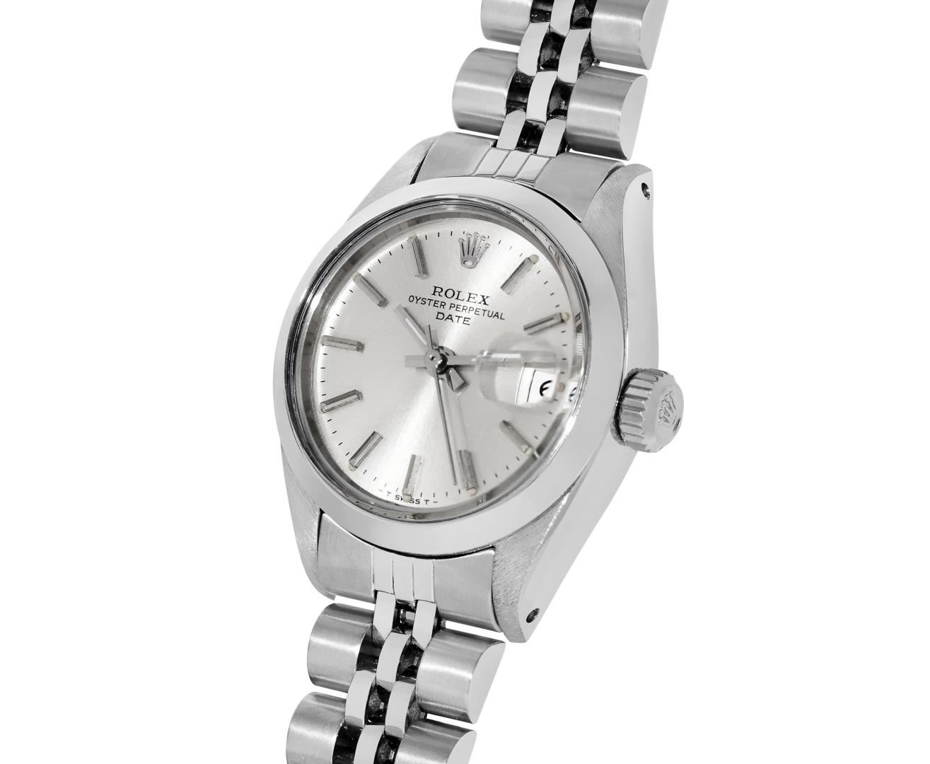 One Rolex Ladies Pre Owned Stainless Steel Date Wristwatch Polished Bright with Satin Finish, Serviced & Electronically Tested, Stainless Steel Case: 26mm, Stainless Steel Crown, Stainless Steel Smooth Bezel, Custom Crystal: New Acrylic With Magnifying Date Window. Custom Hands: New Luminescent Hands. Rolex Movement: Automatic Winding Movement 2035. Rolex Dial: Factory Silver With Index Hour Markers And Lumi Dots. Date Window: 3 O'Clock Position Date Display, Model: Date. Condition: G-6 Extra Fine. Rolex Bracelet: Stainless Steel Jubilee Band. Bright Polish & Satin Finish. 6.0 Inch Length, Adjustable. Standard Clasp, With Rolex Logo. This Watch Has Been Serviced Time Tested And Is In Excellent Condition. It Is Free Of All Scratches And Dents. This Watch Comes With A Rolex Box.