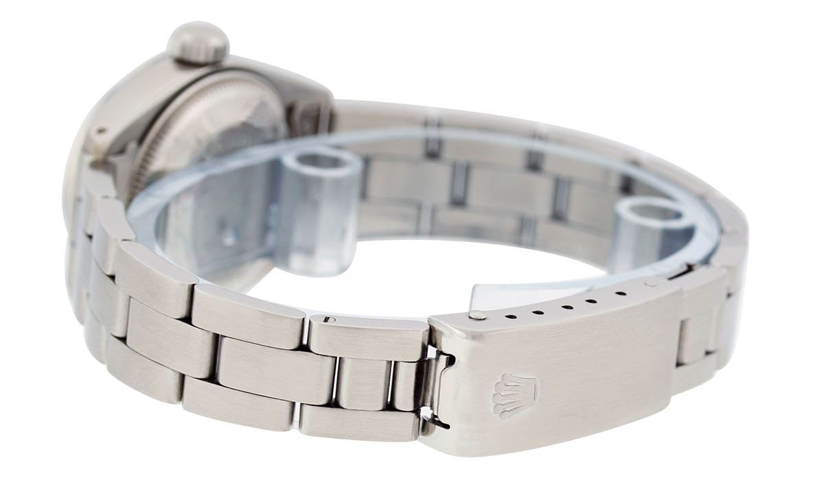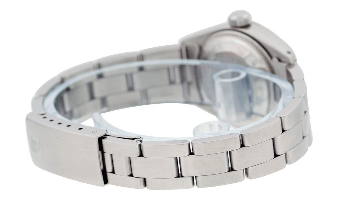 One Ladies Rolex Datejust Polished Bright with Satin Finish, Serviced & Electronically Tested, Stainless Steel Case:26mm, Stainless Steel Crown, Bezel: Stainless Steel Bezel. Custom Crystal: Acrylic Cyclops Lens. Movement: Automatic Winding Movement Caliber 2030. Dial: Silver Index Dial. Date Window: 3 O'Clock Position Date Display, Model: Datejust. Condition: G-6 Extra Fine. Bracelet: Stainless Steel Oyster Band. Bright Polish & Satin Finish. 6.0 Inch Length, Adjustable. Standard Clasp, With Rolex Logo. This watch has been serviced and polished and its free of all dents and scratches.