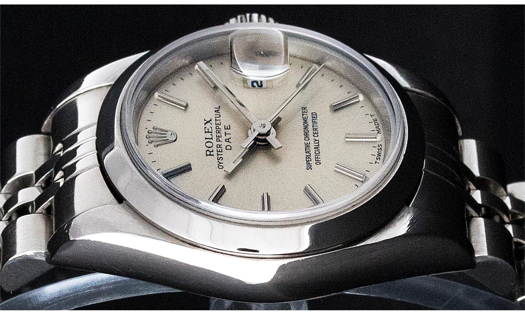 One Ladies Pre Owned Quickset Stainless Steel Rolex Date Polished Bright with Satin Finish, Serviced & Electronically Tested, Rolex Stainless Steel Case: 26mm, Rolex Stainless Steel Crown, Rolex Bezel: Stainless Steel Smooth Bezel. Crystal: Sapphire With Magnified Date Window. Hands: Luminescent Hands. Rolex Movement: Automatic Winding Movement 2230. Rolex Dial: Silver Index Dial With Luminescent Dots & Dash Track. Date Window: 3 O'Clock Position Date Display, Model: Quickset Datejust. Condition: G-6 Extra Fine. Rolex Bracelet: Stainless Steel Jubilee Band. Bright Polish & Satin Finish. 6.0 Inch Length, Adjustable. Standard Clasp, With Rolex Logo. This Watch Has Been Serviced Time Tested And Is In Excellent Condition It Is Free Of All Scratches And Dents.